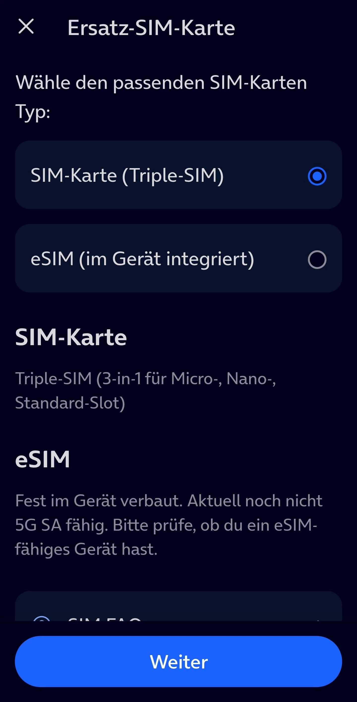 Dann kannst du im nächsten Schritt eine Ersatz-eSIM, also einen Tausch auswählen. Hierbei wird die alte eSIM deaktiviert und die neue aktiviert.