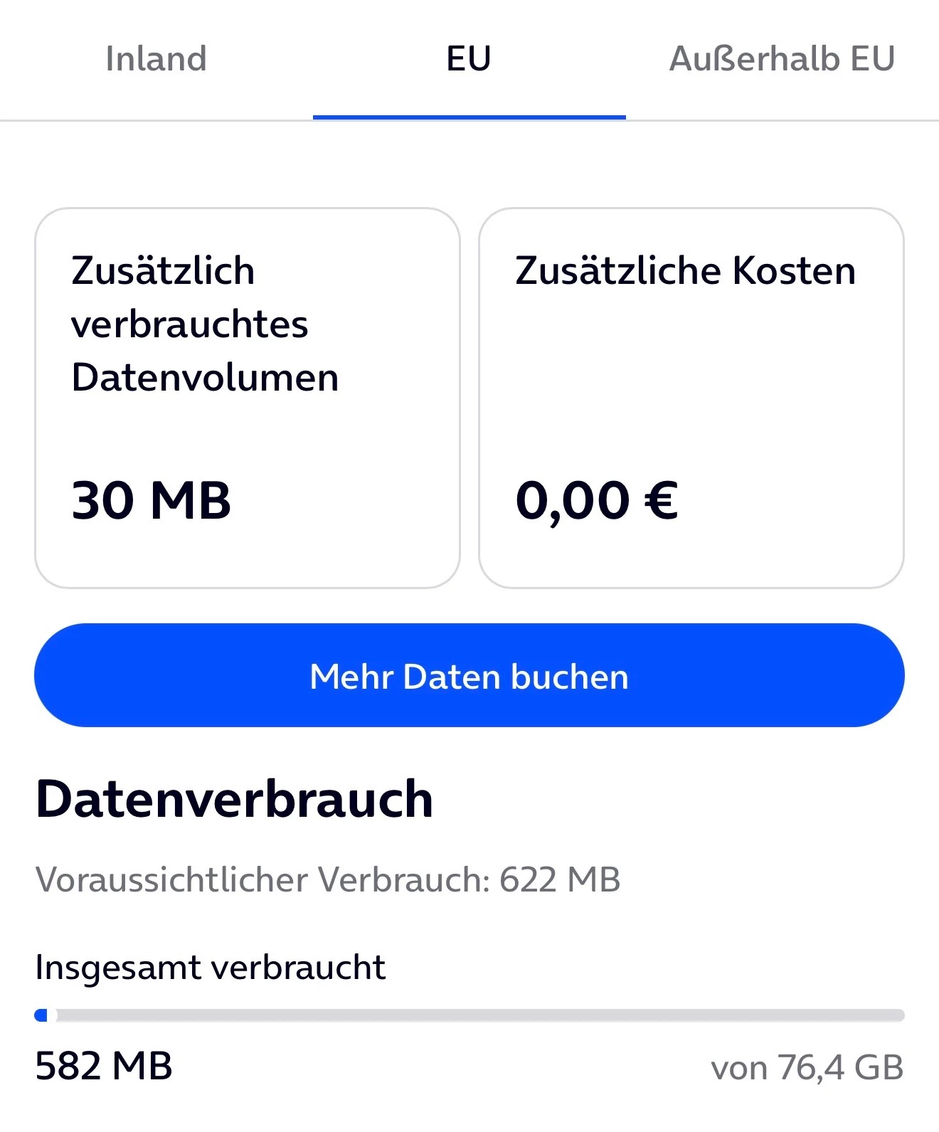 auch ich bin gerade im Ausland (Niederlande) und meine Datacards laufen nur auf Sparflamme. Laut App bin ich im „zusätzlichen Datenverbrauch“, habe aber noch knapp 75GB Daten zur Verfügung. Somit bin ich aber im gedrosselten Bereich (Ein nur ab und zu erfolgreicher Speedtest bringt 0,01Mbps). Die Multicards funktionieren einwandfrei.