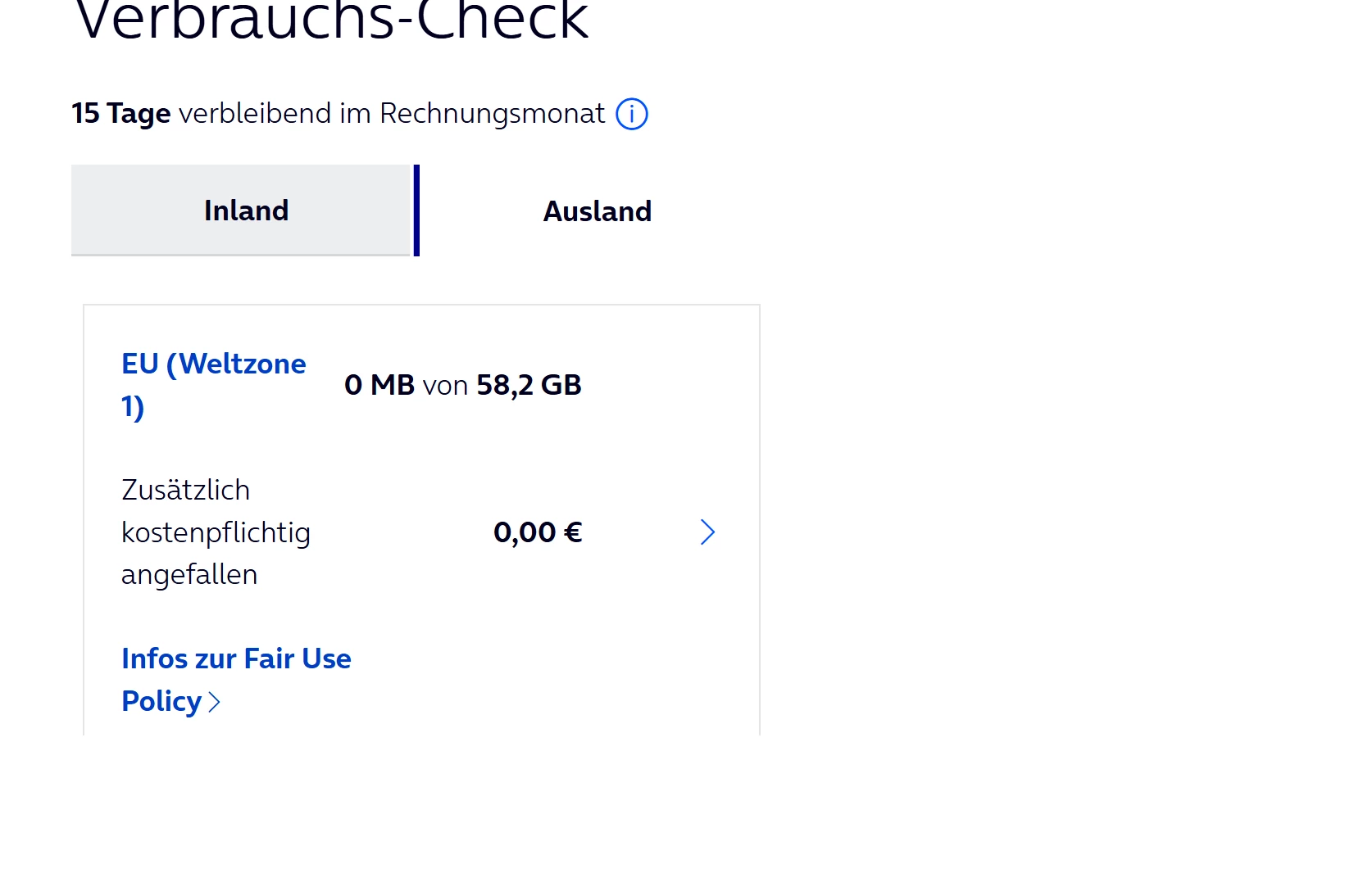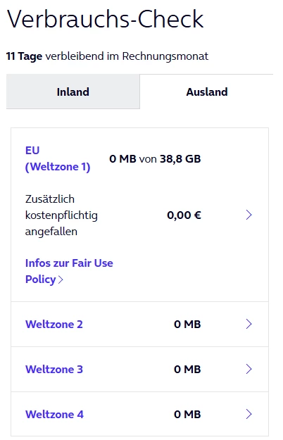 Ich war letzte Woche für 2 Tage in einem anderen EU-Land. Weder in der App noch in meinem Kundenbereich per Webseite kann ich die im Ausland verbrauchten Daten sehen. Dort taucht kein einziges MB auf.