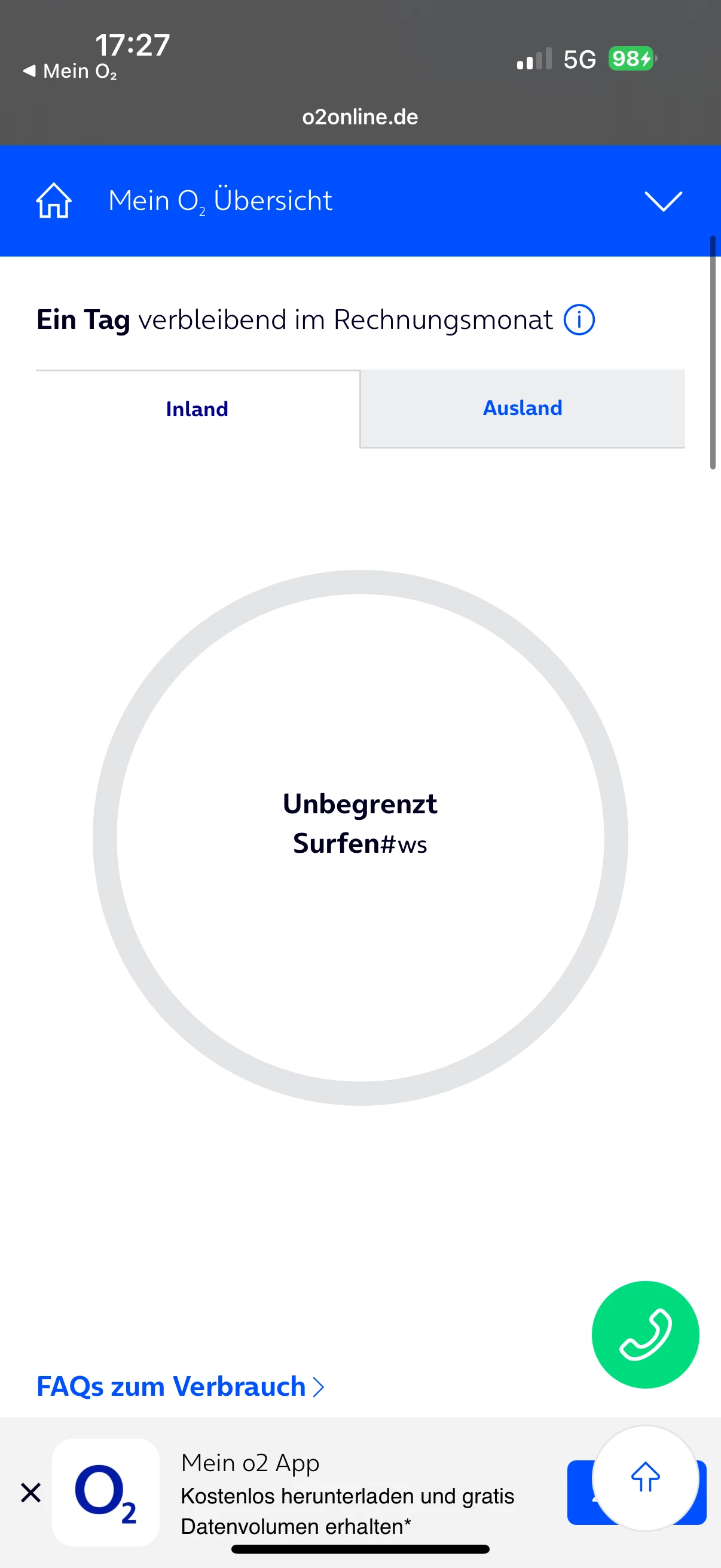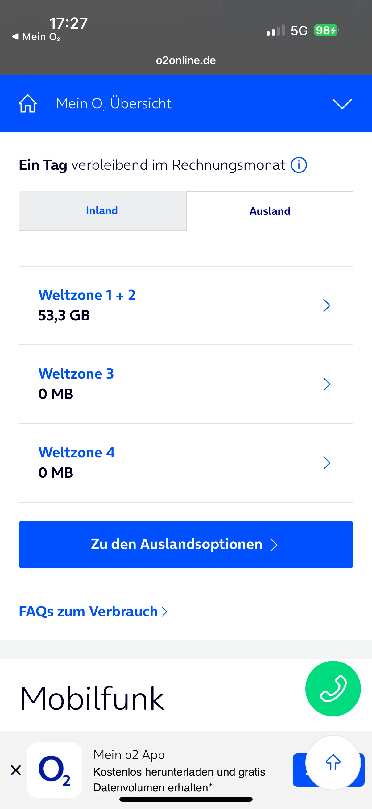 Hallo , ich befinde mich derzeit auf Mallorca , 64,7 GB  sind kostenlos … danach 1,547 Euro pro GB . Weder in der O2 App noch online kann ich den aktuellen Verbrauch sehen . Fehlermeldung wenn ich Online schauen möchte ! Help me!