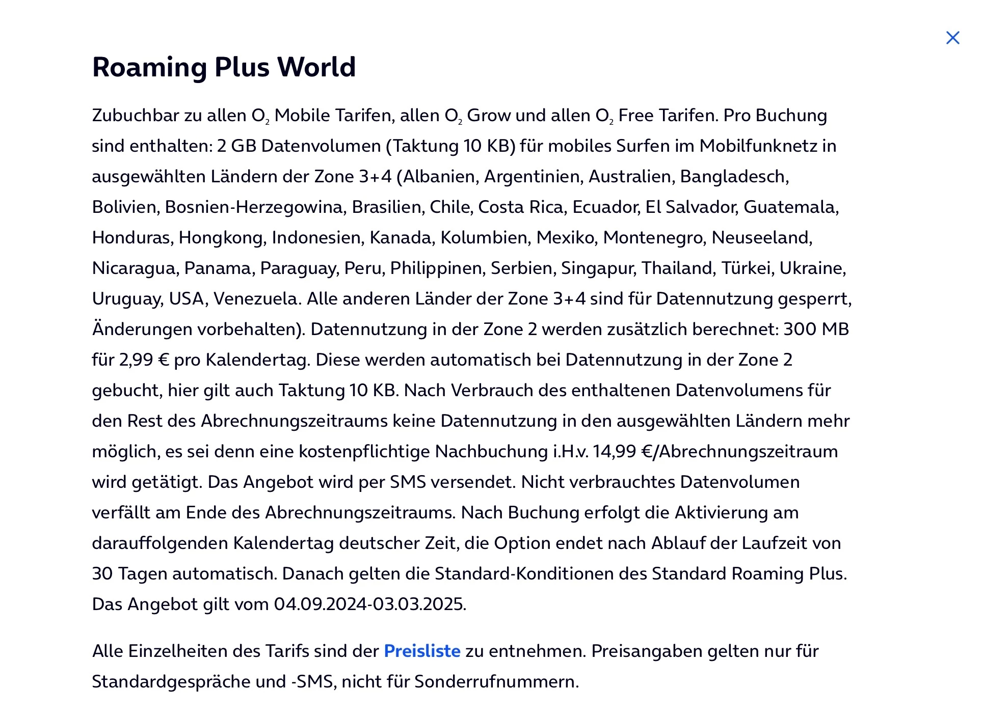Der Tarif ist o2 Mobile M Boost Online und die aktivierte Roaming Option ist Roaming Plus.