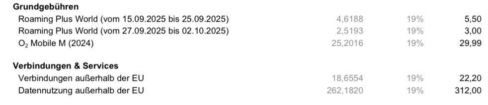 leider wurde mir für meine letzte Monatsrechnung von o2 ein Betrag von 394,48 EUR in Rechnung gestellt. Davon fallen nur 312 EUR auf Datennutzung außerhalb der EU auf.