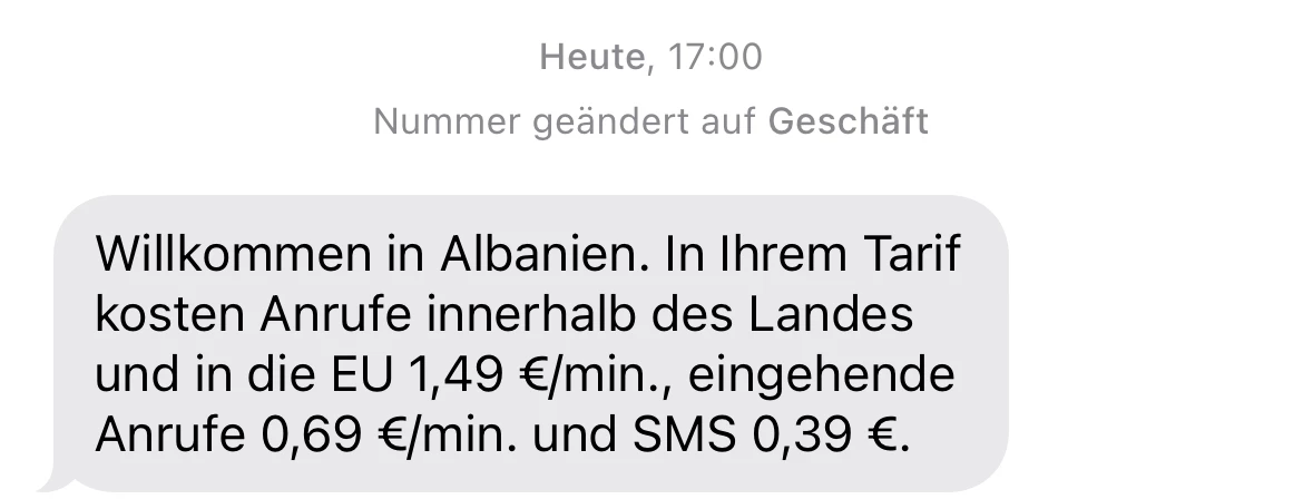 Dann kommt noch nicht mal eine SMS wie üblich bekannt, dass man sich in Albanien befindet, sondern nur der Rechnungshinweis diesbezüglich