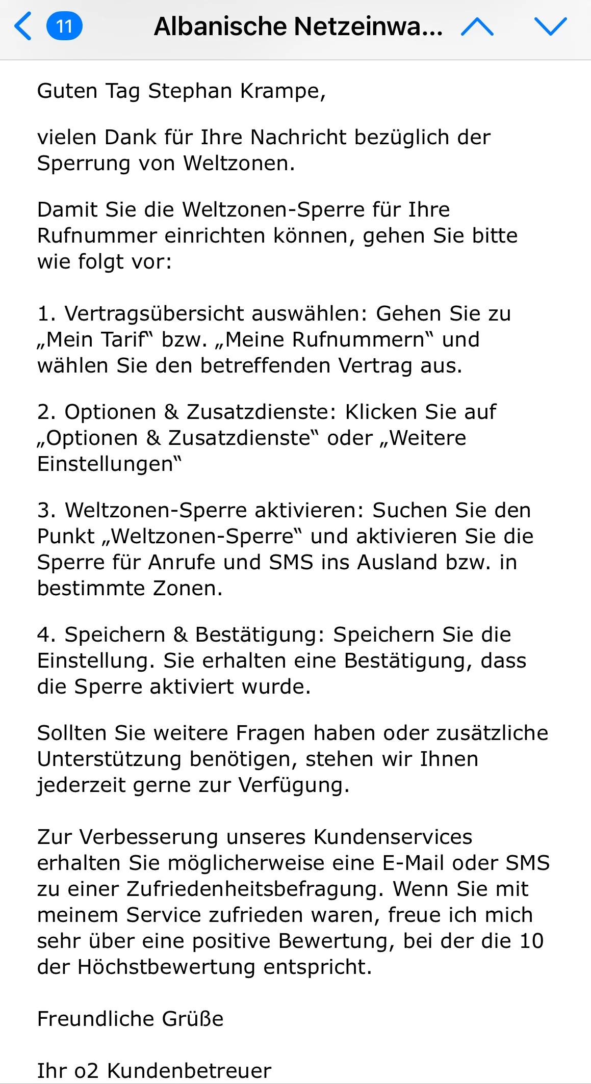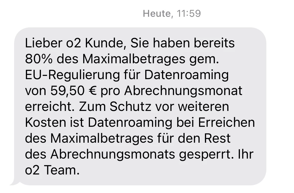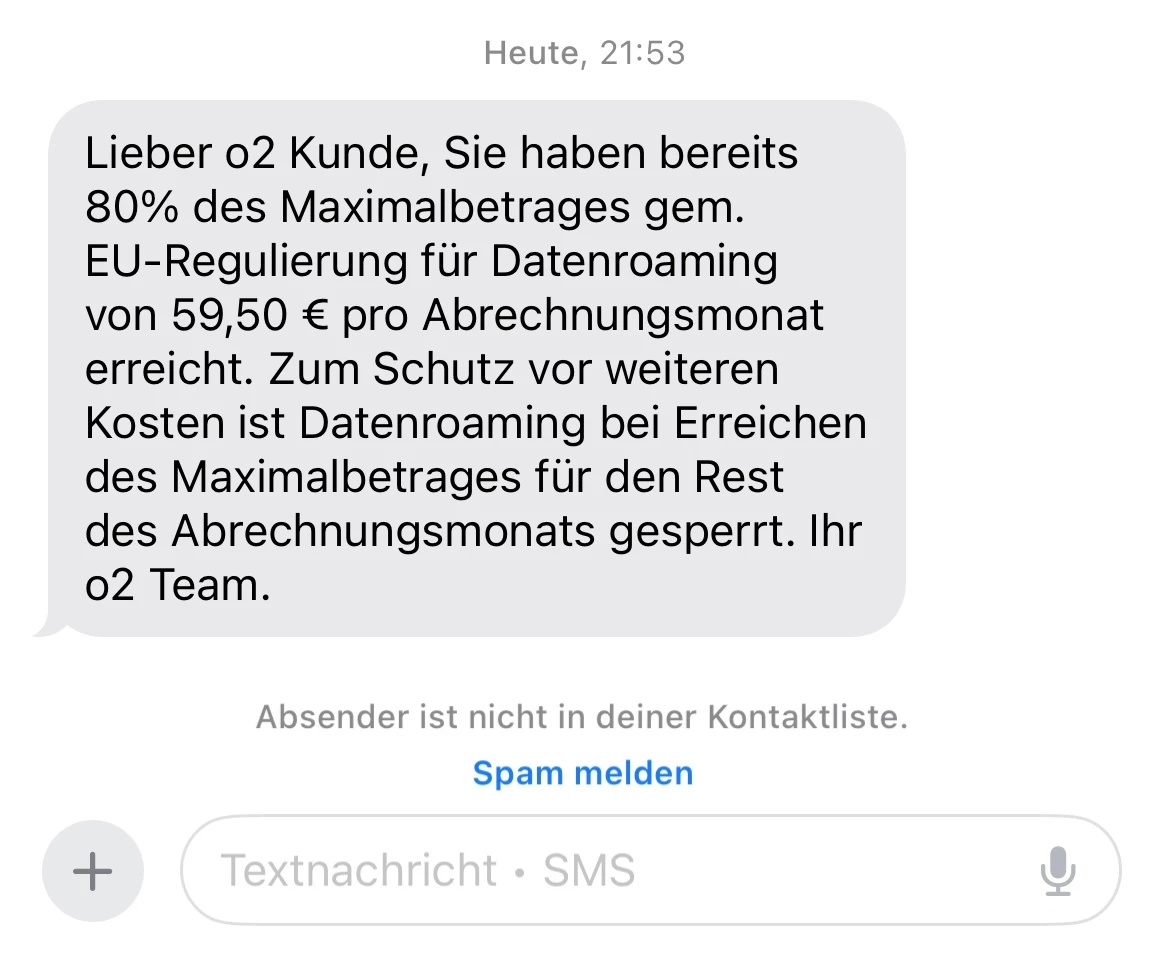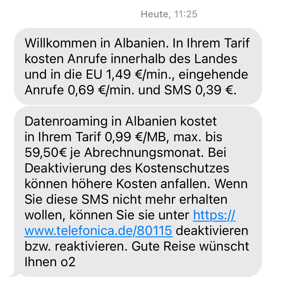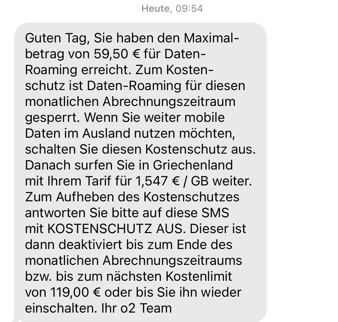 Soeben wurden die albanischen Sendemasten anscheinend wieder hochgefahren: Obwohl ich in meinem Haus in Korfu sitze (so wie jeden Abend seit ca 2 Wochen), und obwohl ich manuelle Netzwahl auf COSMOTE eingstellt habe, war ich gerade anscheinend für eine kurze Zeit im albanischen Netz, weil ich diese SMS erhalten habe und wieder 59€ für 47MB zahlen soll. Bitte um eure Lösungsfindung! ​@o2_Rebecca du wolltest noch was klären! Bitte kläre auch, wie mir diese Kosten erstattet werden. Danke