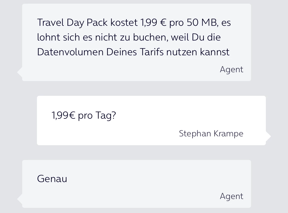 Oh man, hast wohl einen unwissenden im Chat erwischt. Die 1,99 EUR gelten pro Tag nur in Weltzone 2 und auch nur wenn man vor Ort ist. Das Pack ist EU reguliert und hat eine Sperre für die WZ 3 und 4 integriert. Probiere es erneut.