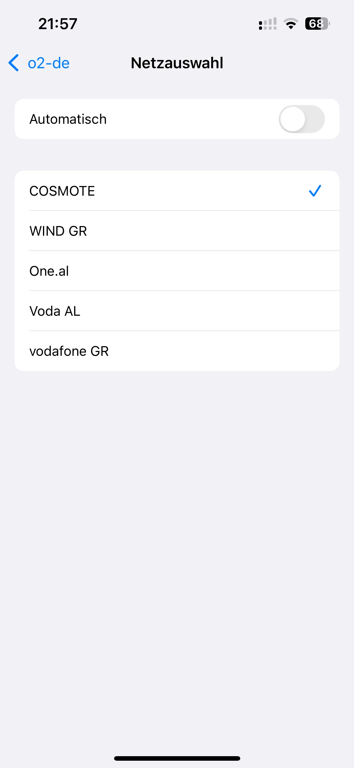 Alternativ muss ich auf Vodafone wechseln, wo das albanische Netz anscheinend eine andere Konfiguration hat. Vodafone Kunden mit manueller Netzwahl und Iphone14 werden jedenfalls nicht mit dem Albanischen Netz verbunden, das steht fest.