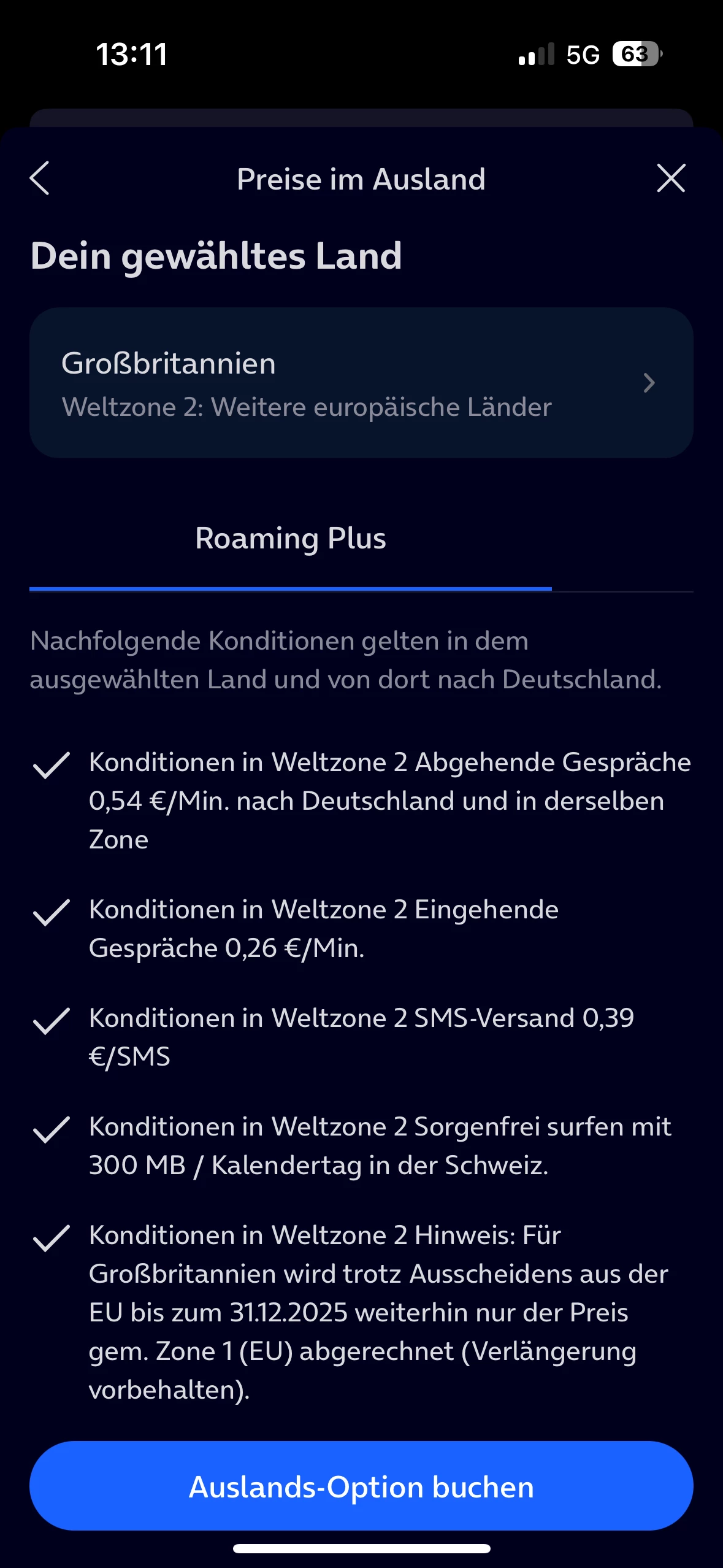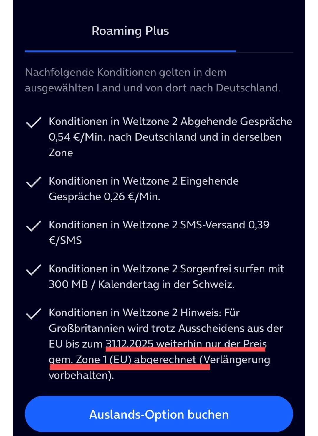 Bis voraussichtlich 31.12.2025 gilt noch Weltzone 1. EU Roaming