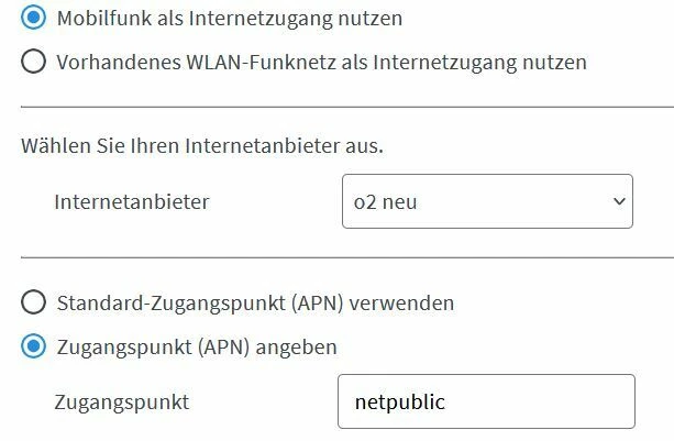 Um die öffentliche IP nutzen zu können, ist es notwendig den Zugangspunkt / APN zu ändern, bzw einen neuen Zugangspunkt zu erstellen.