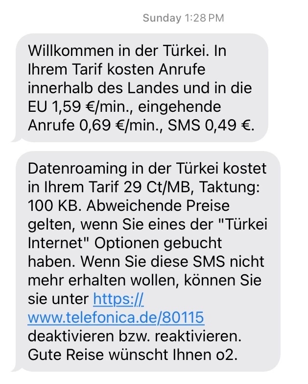 In der Info-SMS die mir, ebenfalls unbemerkt, zu dem Zeitpunkt zugestellt wurde, heißt es, dass ich in meinem Tarif (Prepaid S ohne Zusatzoptionen) 0,29/MB Roaming in der Türkei zahle.