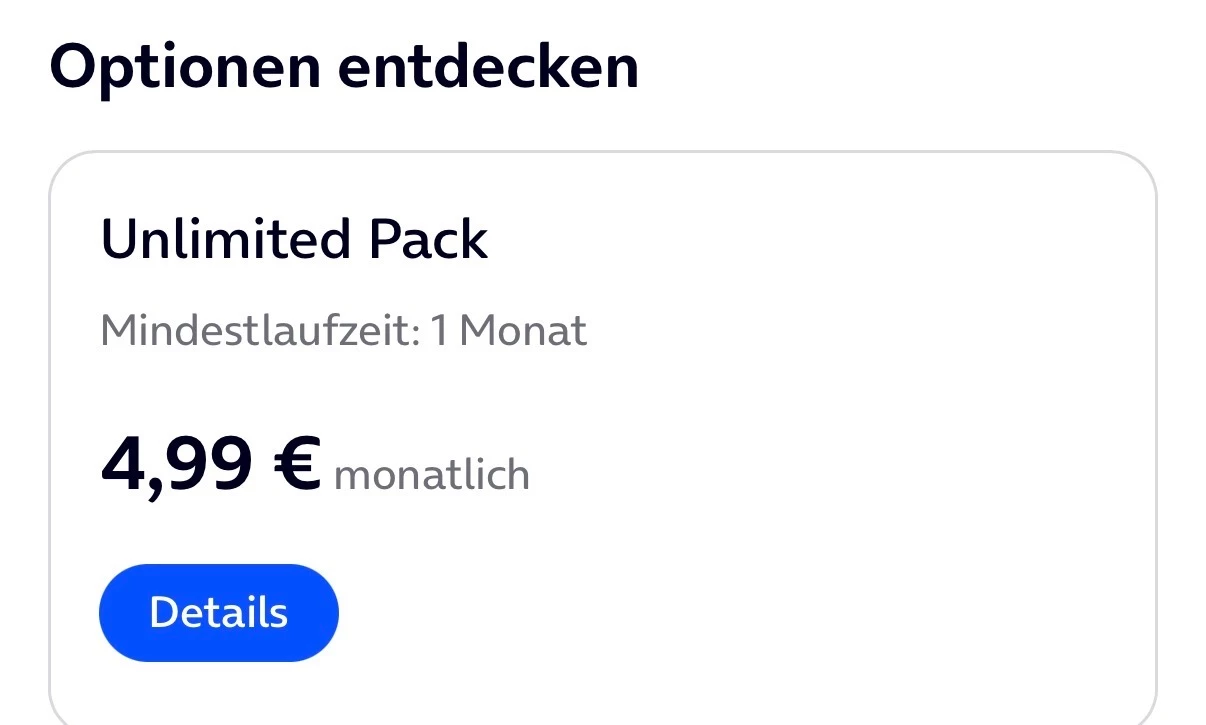 mir wurde in der Mein O2-App für 4,99 EUR ein Unlimited Pack als Zusatzoption zu meinem O2 Mobile XL-Tarif (2024) angeboten. Cool. Das hab ich natürlich sofort bestellt, siehe Screenshots.