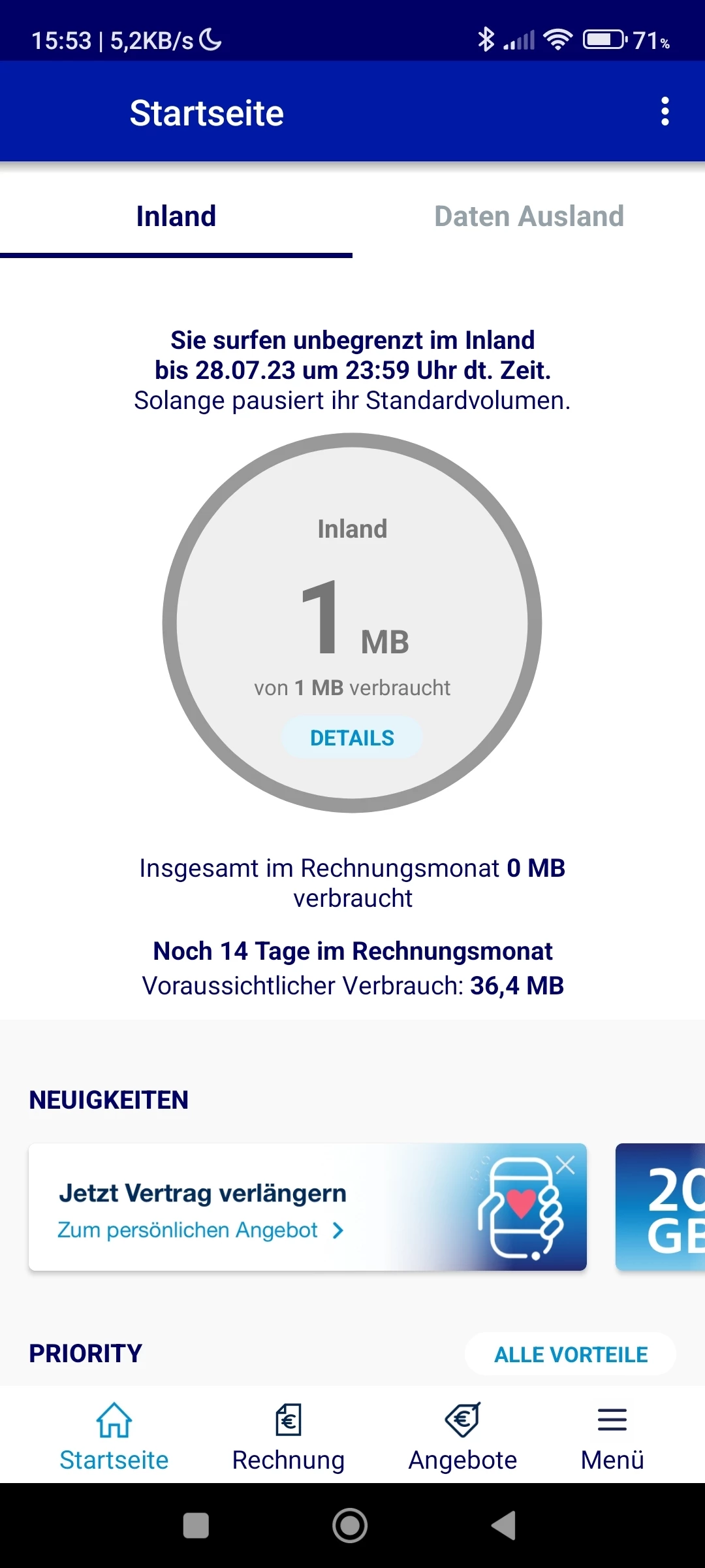 Guten Tag, ich habe auch ein Problem. Ich bin im Urlaub an der Nordsee, ich habe gestern eine Wochemflat gebucht und ich bekomme in der App aber angezeigt das mein Datenvolumen verbraucht sei und ich mit reduzierter Geschwindigkeit surfe. Tatsächlich komme ich beim Geschwindigkeitstest kaum oder nur sehr gering über 1 Mbit. Ich weiß nicht was da los ist, aber das es an der Netzabdeckung liegt kann ich mir kaum vorstellen, mehrere andere Anbieter absolvieren den Speedtest mit 20 Mbit und hoher vom Handy aus. Auch der Empfang wird mit mindestens 4 meist 5 Balken angegeben. Router ist der ZTE MF920U