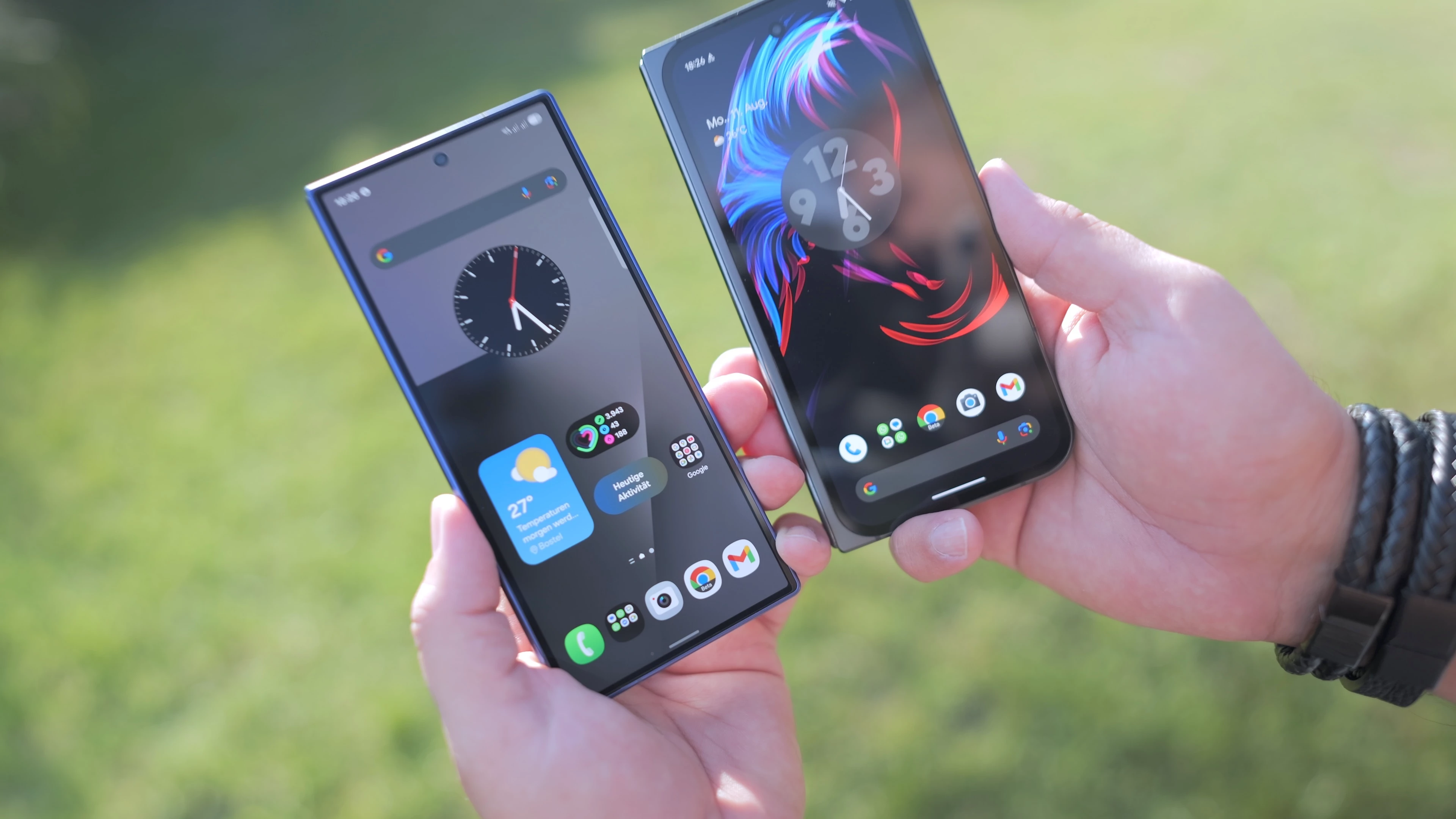 Nach max 24 Std ein perfektes Ergebnis - Links Fold7 mit Anti-Reflexions-Schutzfolie von Samsung - rechts Google Pixel 9 pro Fold ohne Folie in direkter Sonne