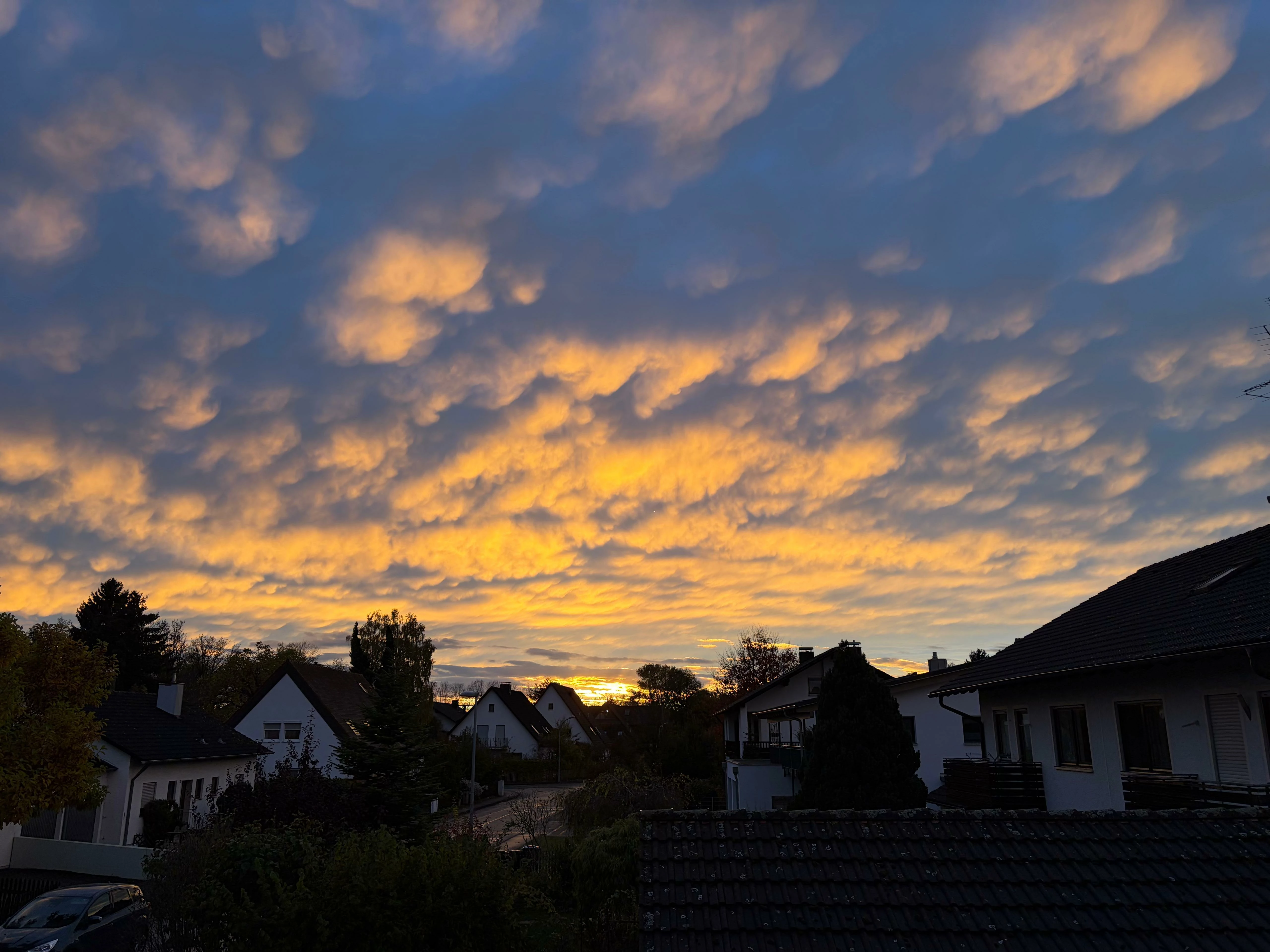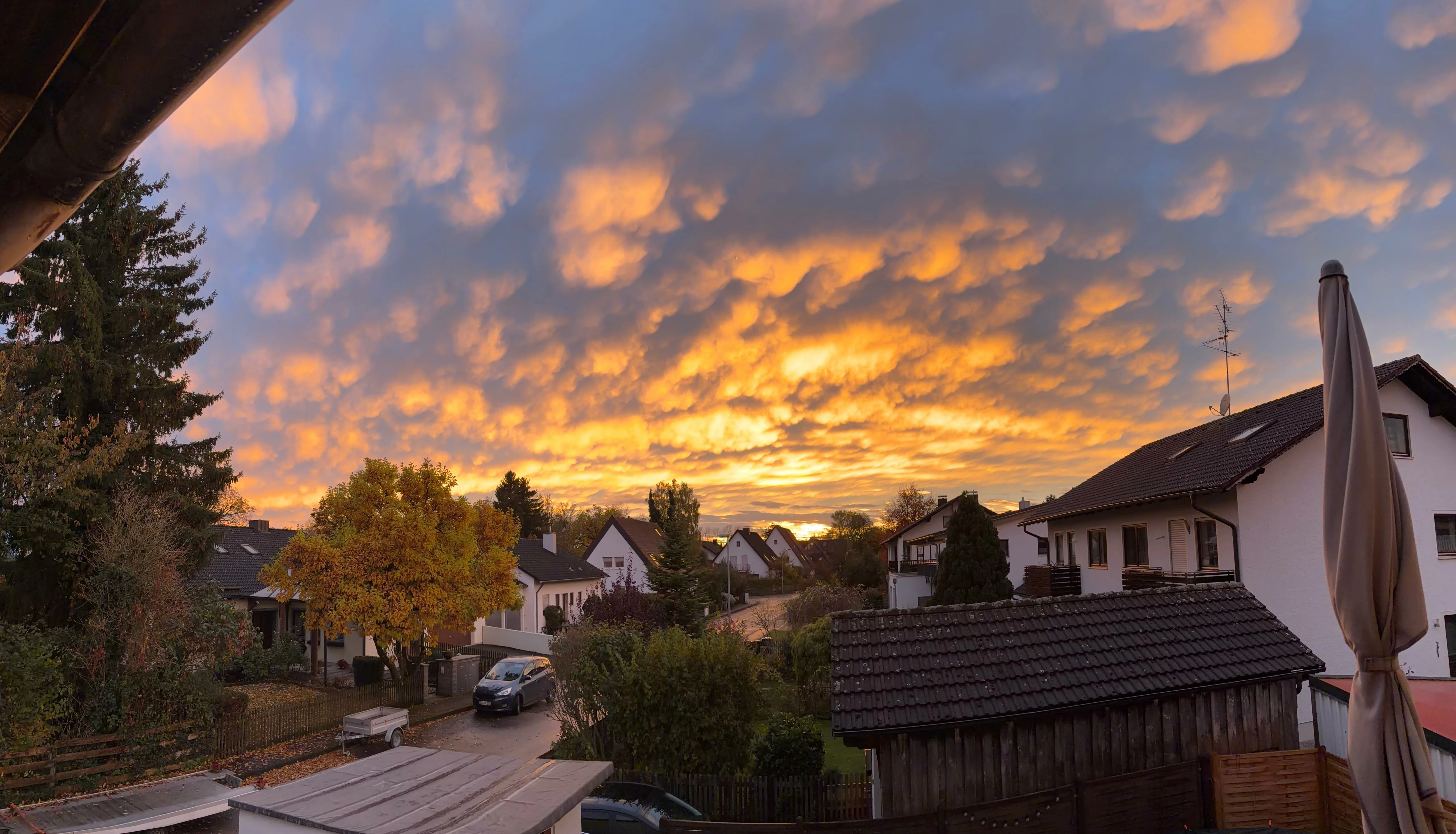 Panorama Funktion. Goldener Himmel mit Sonnenaufgang. Im Vordergrund Autos, Häuser und eine kleine Straße.