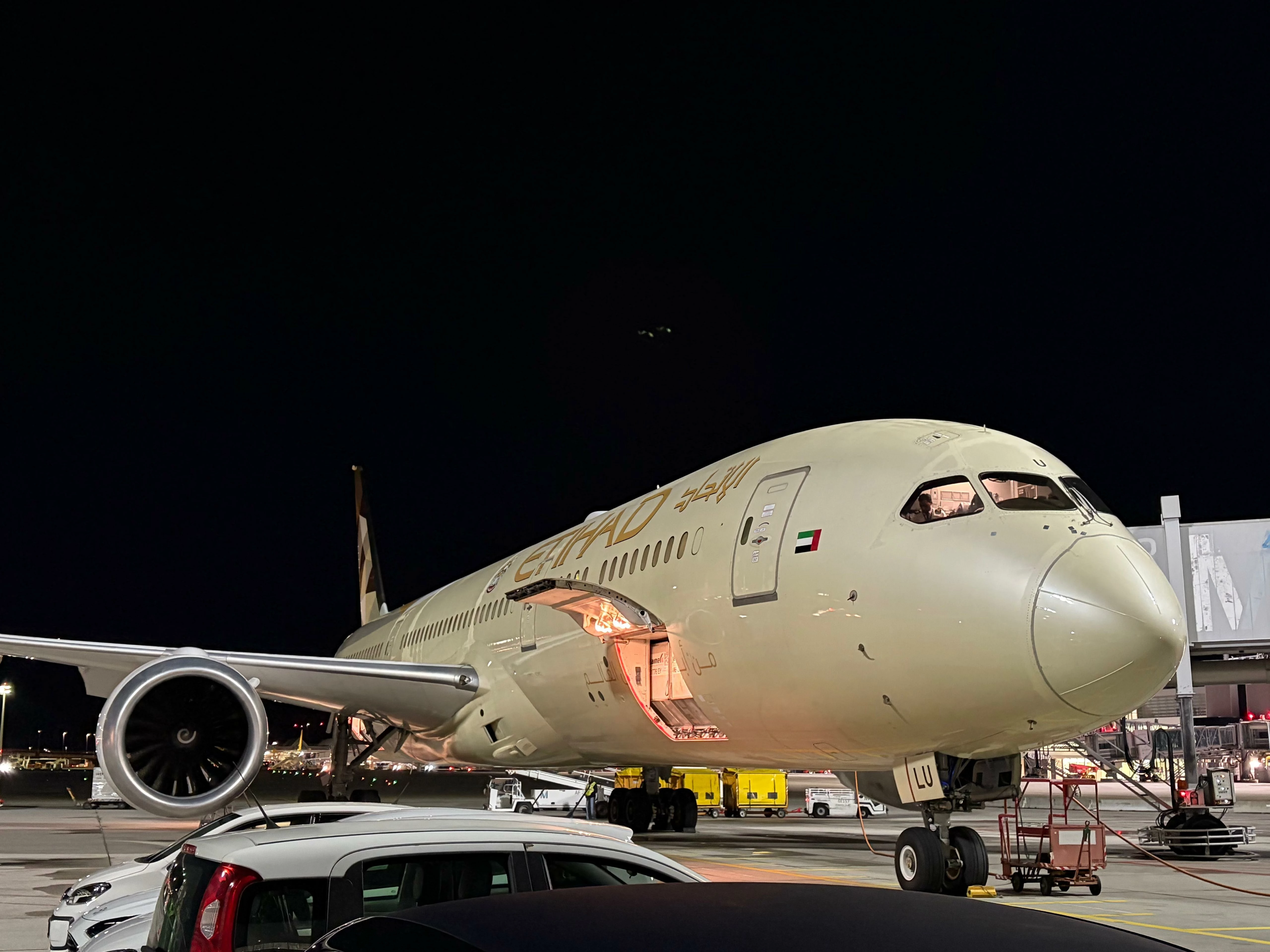 Nachtaufnahmen des Flugzeugs. Im Vordergrund Autos. Die Tür des Flugzeugs ist geöffnet.