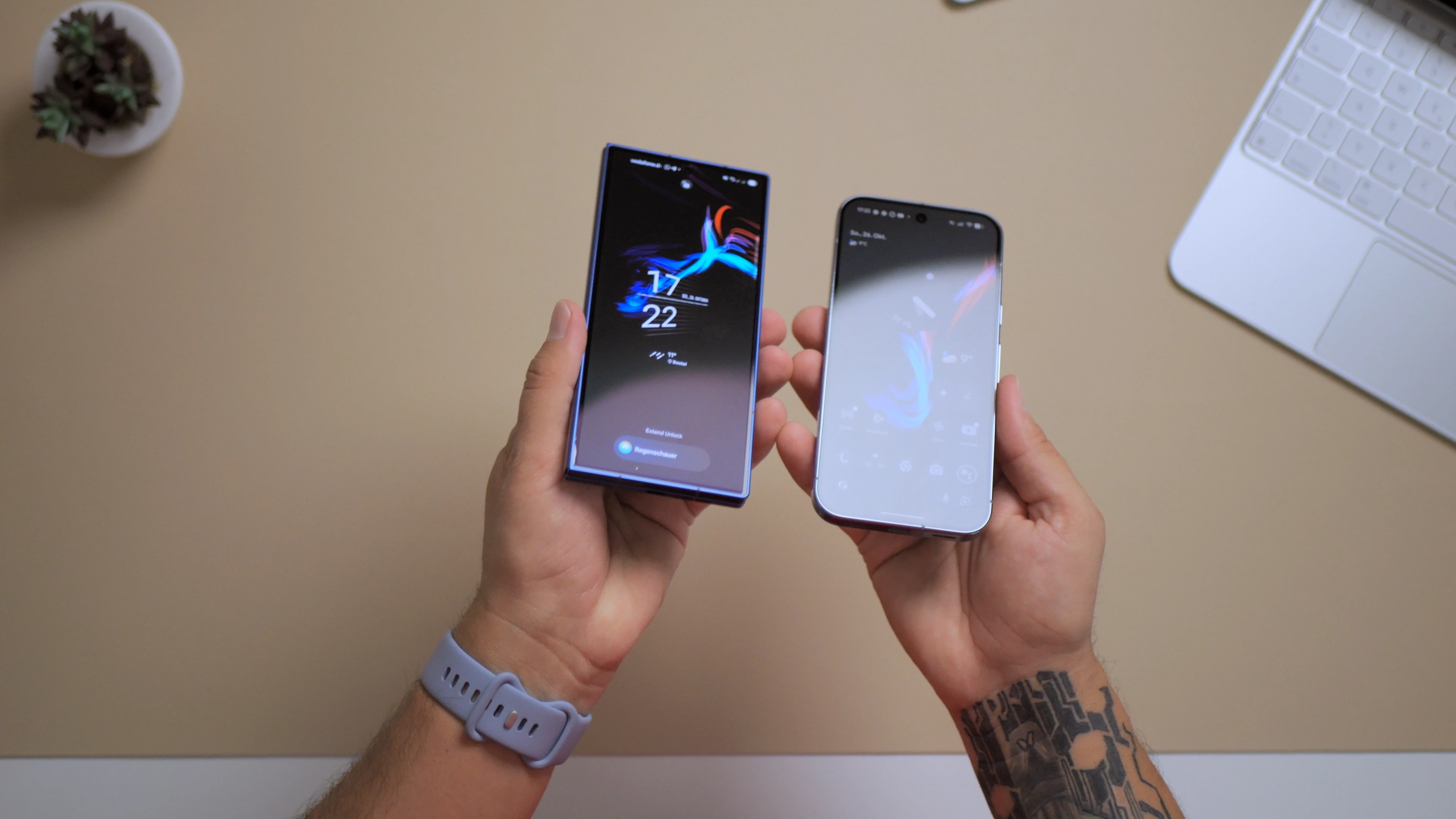 Aber – und hier ist das angekündigte Haar in der Displaysuppe: Wenn man das Pixel 10 Pro direkt neben ein aktuelles Flaggschiff von Samsung wie dem Galaxy S25 Ultra legt, bemerkt man einen deutlichen Unterschied bei den Reflexionen. Während Samsung es mittlerweile meisterhaft versteht, das Display fast komplett zu entspiegeln (ohne die Nachteile der Vergangenheit), wirkt das Google-Display im Vergleich wie ein klassischer Spiegel. Wenn das Display aus ist oder man in einer sehr hellen Umgebung arbeitet, fallen diese Spiegelungen doch stark auf. Das Display ist zwar hell genug, um dagegen „anzuleuchten“, aber Samsung zeigt hier einfach, dass es noch ein Stück besser geht. Dennoch: Für sich allein betrachtet ist das Pixel-Display absolute Spitzenklasse.