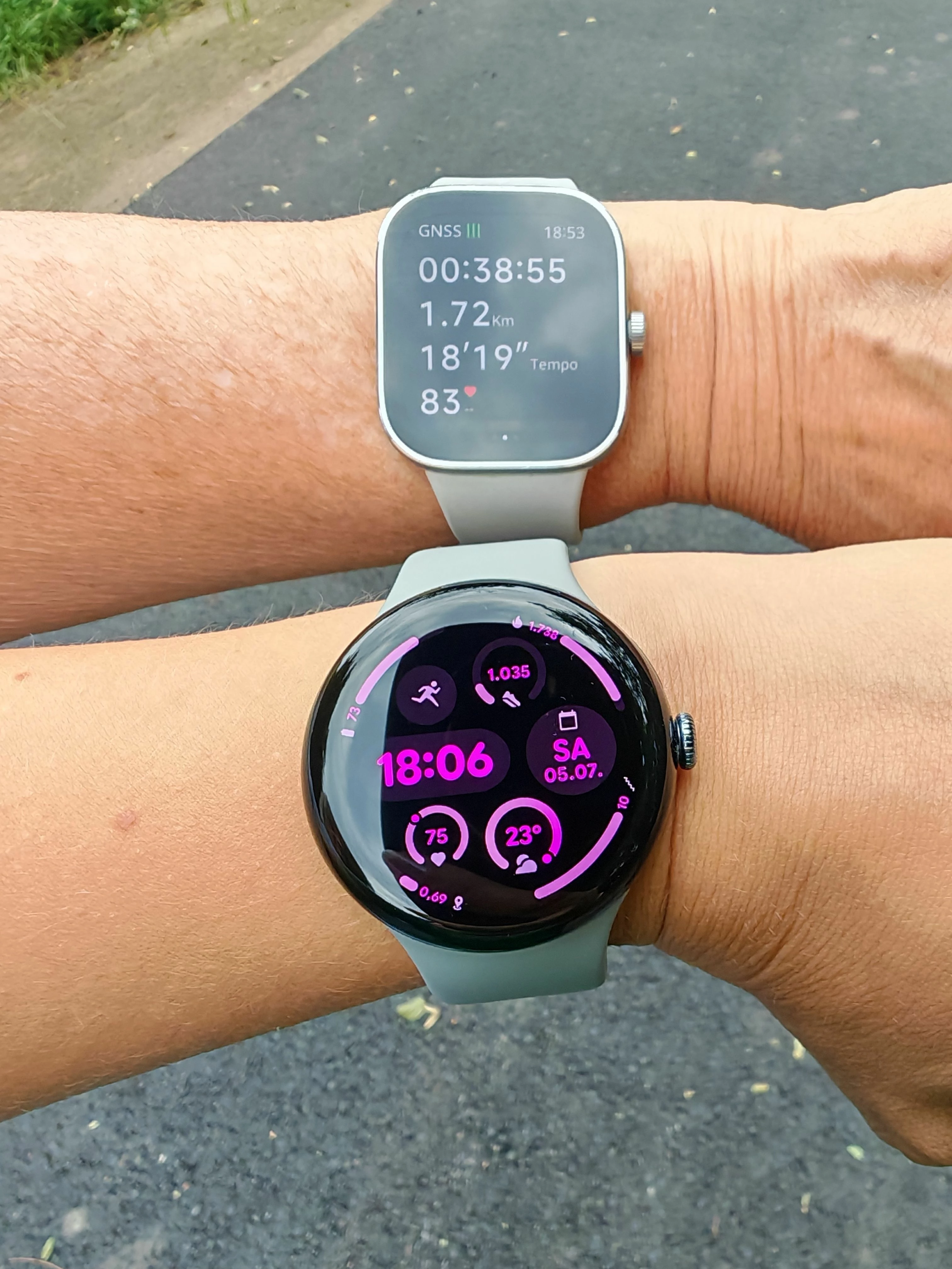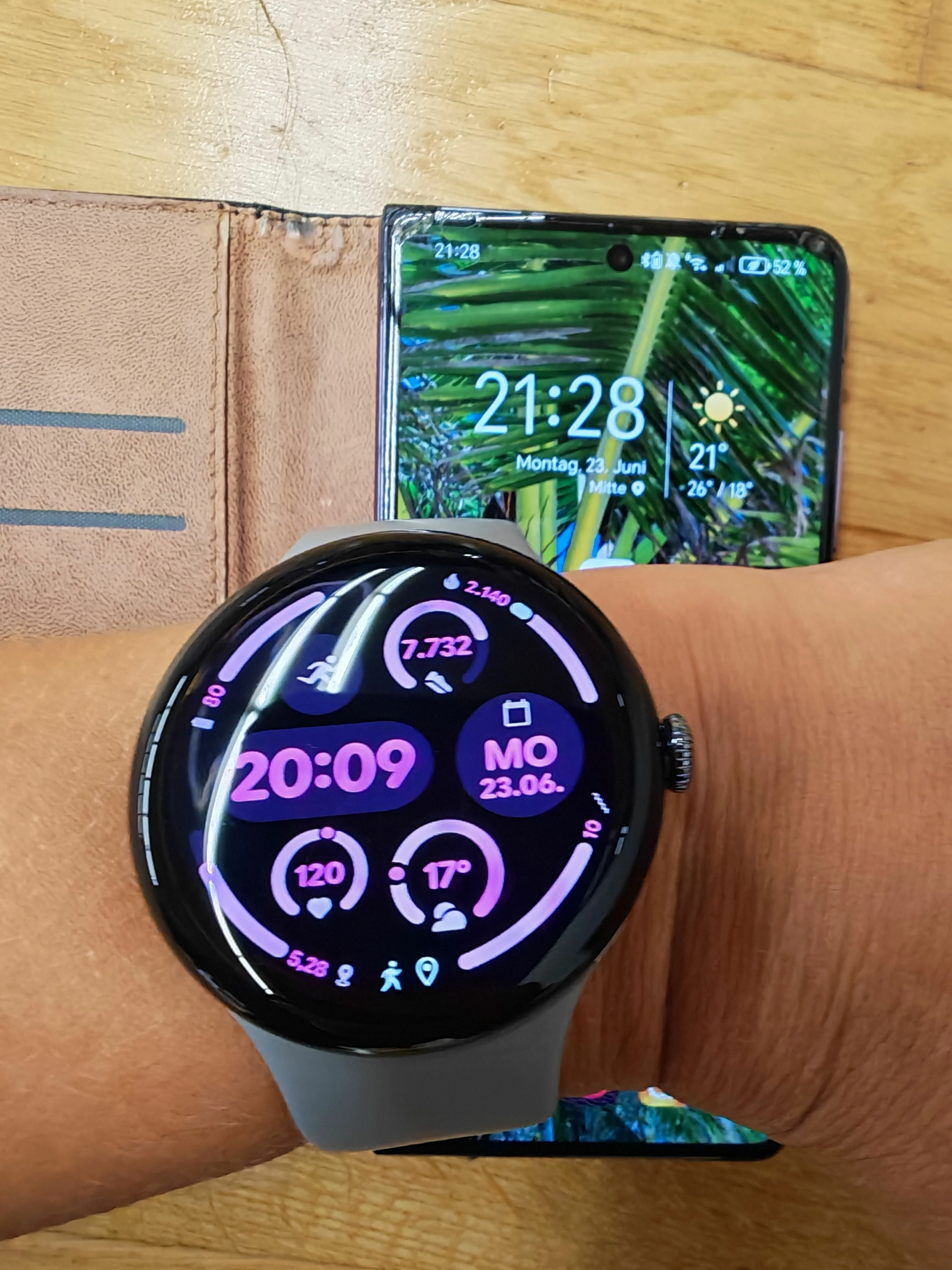 Uhren auf 100% geladen morgens, abends 1 Stunde Training draußen mit GPS aktiv: Pixel 54%, Huawei 60%, also alles im Rahmen.