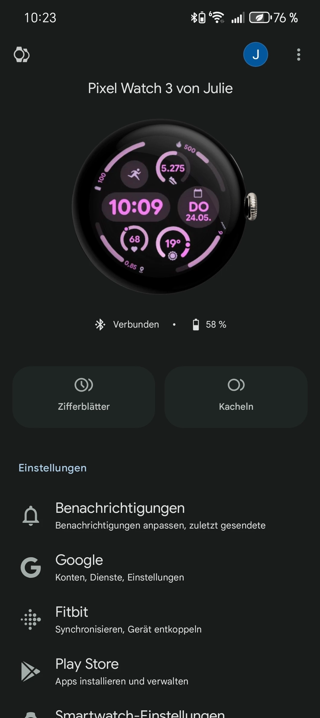 Da Google Fitbit übernommen hat, nutzt die Pixel Watch die Fitbit App. Mit dieser war ich schon vertraut. Neu-User suchen einige Einstellungsmöglichkeiten wahrscheinlich eine Weile, aber das ist bei neuen Apps normal. Um die Uhr allerdings verbinden zu können, muss noch die „Google Pixel Watch“-App installieren. Diese dient auch dazu, um das Ziffernblatt zu personalisieren, Benachrichtigungen anzupassen, Apps auf der Uhr zu installieren und Google Wallet einzurichten.