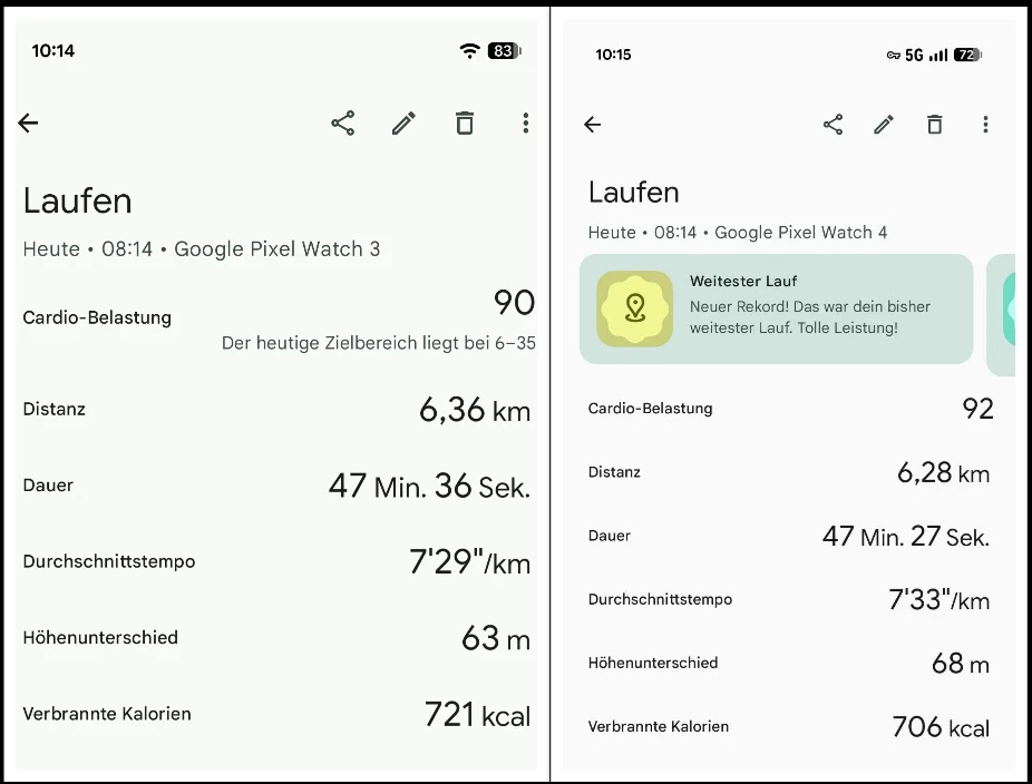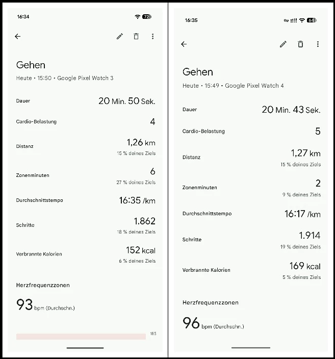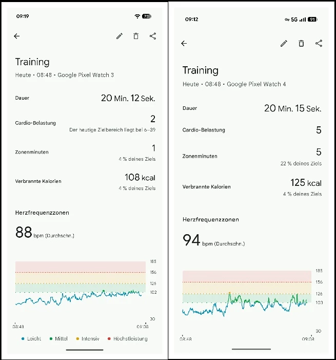 Der deutlichste Unterschied war die Herzfrequenzmessung. Hier wurde ich hellhörig: Die Pixel Watch 4 misst einfach besser und reagiert schneller auf Veränderungen.