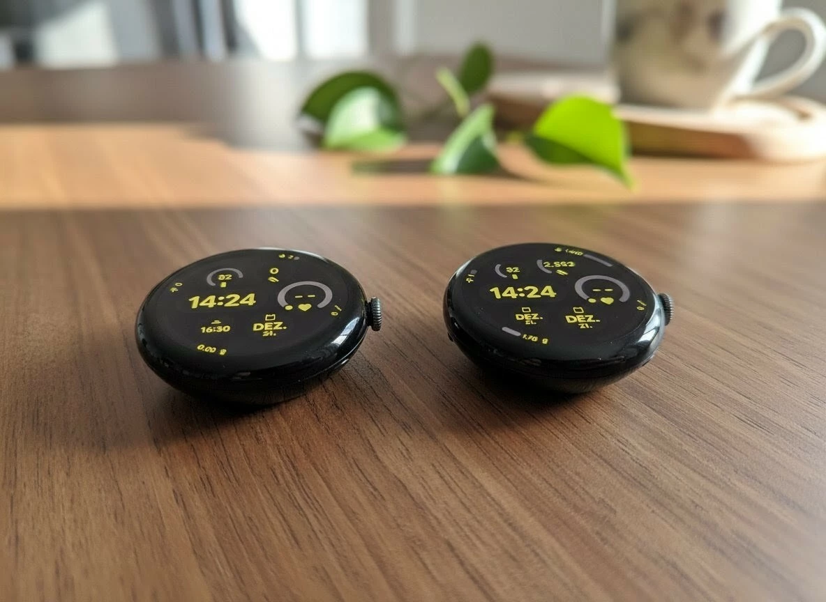 Links die Pixel Watch 3, rechts die Pixel Watch 4. Auf den ersten Blick sind keine Unterschiede zwischen den beiden Modellen sichtbar.