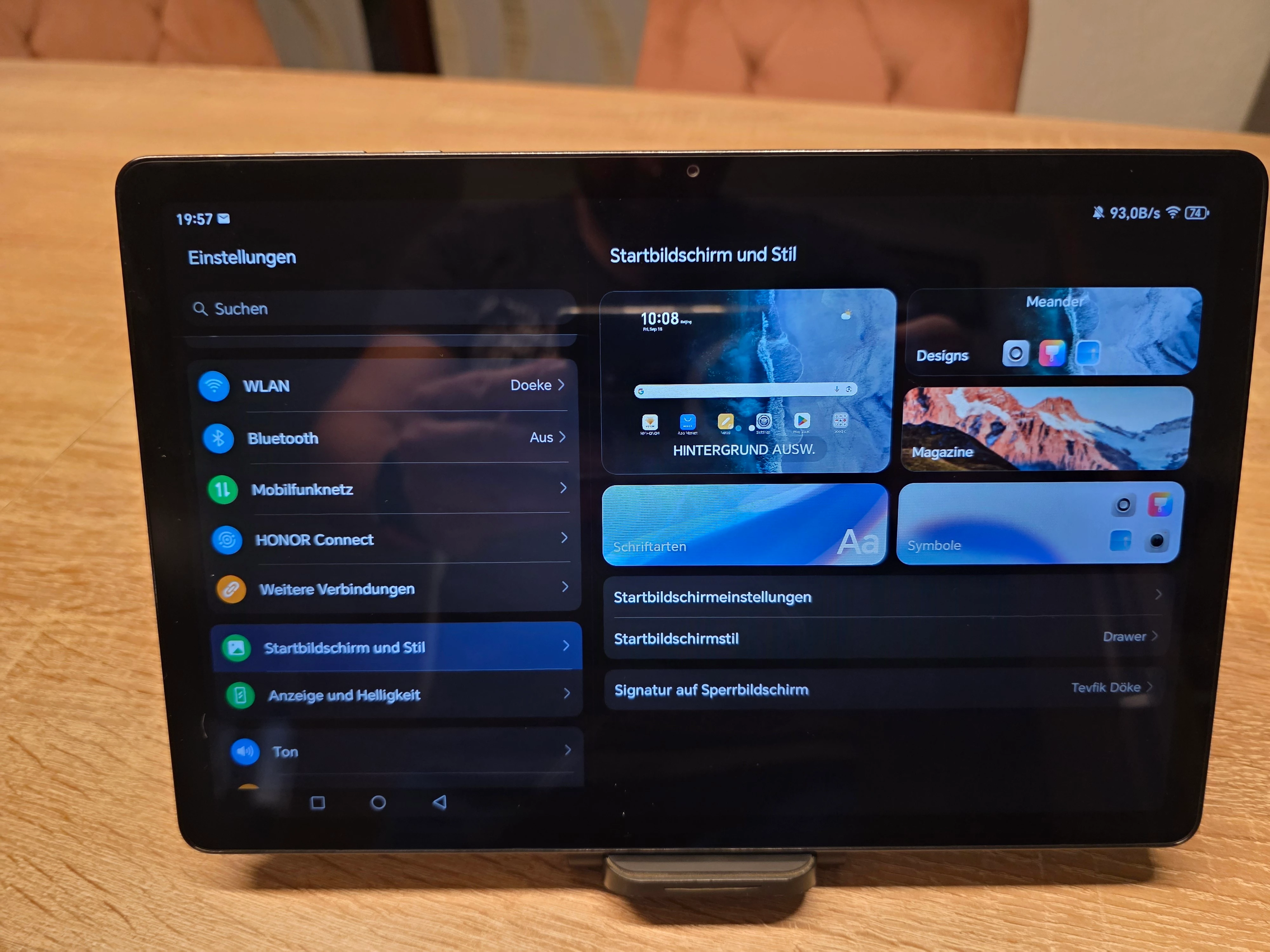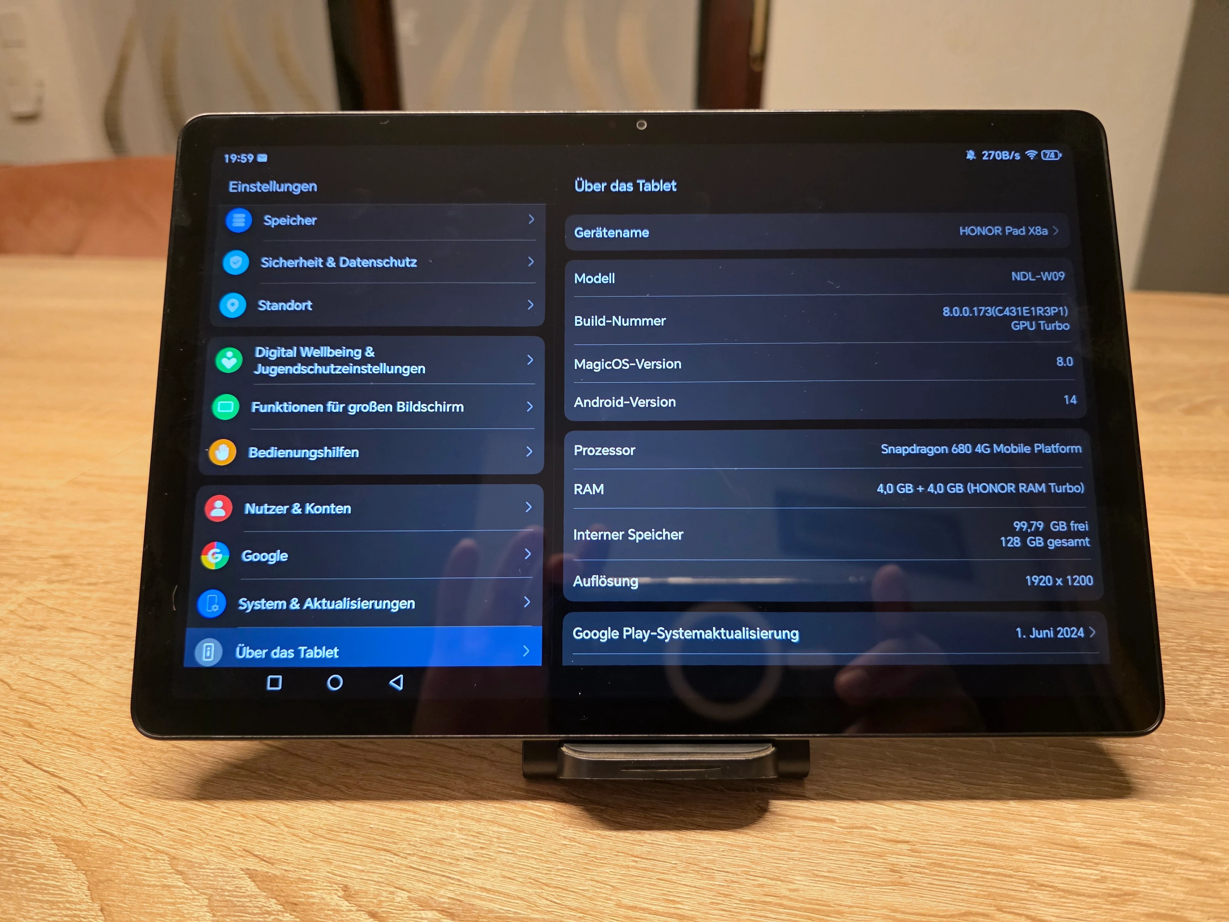 Das Honor Pad X8a wird mit Android 14 ausgeliefert. Honor stülpt seine hauseigene Oberfläche MagicOS 8.0 darauf. Ich persönlich finde es sehr innovativ, da man vieles nach seinem belieben einstellen und personalisieren kann. Einiges an Bloatware ist installiert, die man aber zum Glück deinstallieren kann. Wie viele Android- und Sicherheitsupdates das Honor Magic Pad X8a bekommen wird habe ich leider nichts zu gefunden. Ich gehe aber von 2-3 Updates aus. Die Ausstattung ist mit WLAN, Bluetooth 5.1, USB-C, Quad-Lautsprecher, E-Book-Modus, Full-HD Display mit 90 Hz, eine gut funktionierenden Gesichtserkennung und Speicherkartenerweiterung für ein Tablet dieser Preisklasse gut ausgestattet.