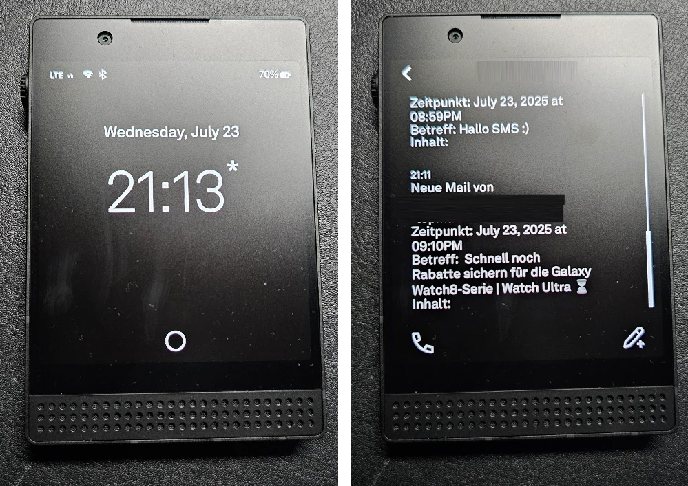 Ganz ohne den Empfang von E-Mails war mir der Minimalismus dann doch zu radikal. Also habe ich ĂŒberlegt, wie ich trotz fehlender E-Mail-App wichtige Benachrichtigungen erhalte. Die fĂŒr mich einfachste Lösung (kostenlos) war, dass ich mit meinem Samsung S23 Ultra und IFTTT eine Lösung bastelte: wenn eine neue E-Mail eingeht, wird automatisch eine SMS mit Absender, Betreff und Uhrzeit an meine Light-Phone-Nummer gesendet. Damit konnte ich wichtige Nachrichten sehen und spĂ€ter beantworten.