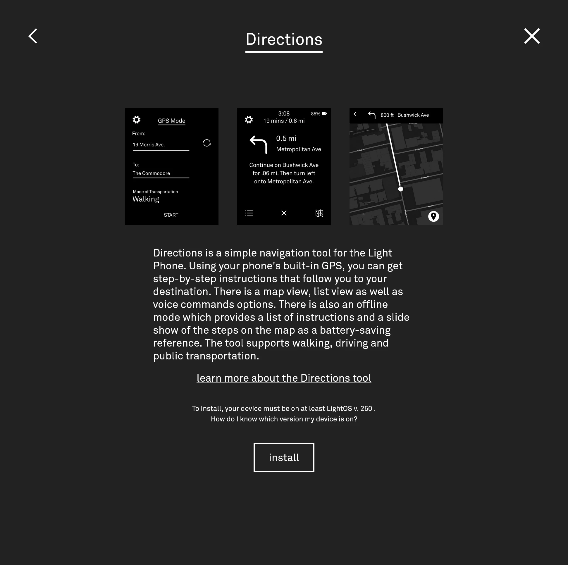 Die Software ist auf das Wesentliche reduziert: Telefon (telefonieren und SMS), Alarm, Album, Kamera und Einstellungen. Statt eines klassischen App-Store gibt es „Tools“, die gezielt vom Hersteller entwickelt werden und nachtrĂ€glich ĂŒber eine WeboberflĂ€che auf das Light Phone installiert werden können. Aktuell gab es wĂ€hrend meines Tests folgende Apps:
