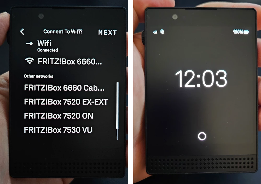 Links W-Lan Verbindung und rechts die Anzeige beim Einschalten des Light Phone 3