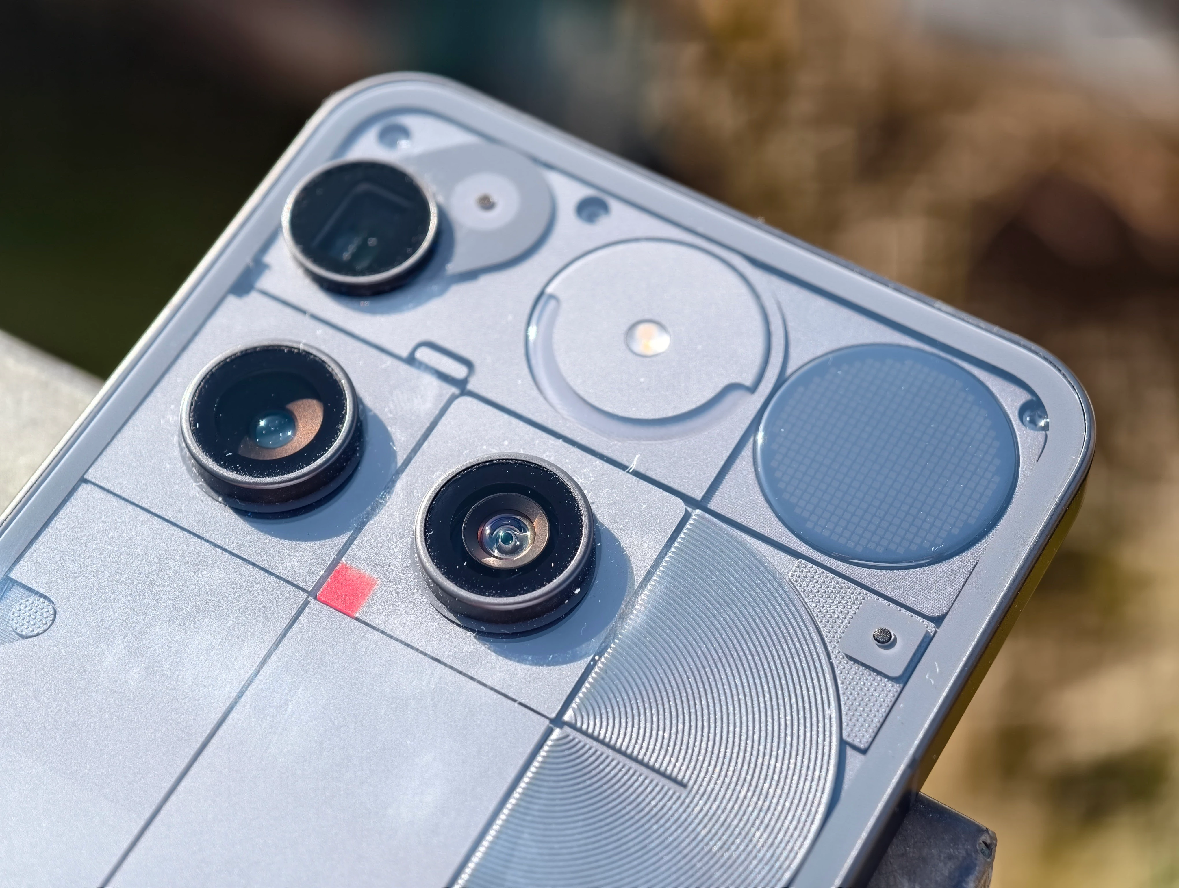 Aber diese eine Kamera… Sie ist - schief? Tatsächlich. Und das ist auch das Merkmal, das den meisten als aller erstes auffiel. Darauf folgte entweder „Wow, das sieht ja toll aus!“ oder „Was ist das denn?“. Ich durfte beides erstaunlich oft vernehmen. Auch wenn ich mich anfangs auch Letzterer Gruppe anschloss, habe ich meine Meinung schnell ins Positive verändert. Ich habe mich schon des öfteren in das Design von Nothing verliebt und hier war es nicht anders. Ich liebe dieses Level an Details das die Firma in das Handy eingebaut hat. Je länger man sich die Rückseite ansieht, desto mehr findet man. Dieses Jahr ist keine prominente Spule für das Wireless-Charging, wie etwa beim 2er, sichtbar. Man setzt stattdessen auf diverse Formen auf der Rückseite. Kreise, Vierecke, Ovale, Dreiecke, es wirkt alles etwas zusammengewürfelt, aber dennoch wirkt es als hätte sich jemand Gedanken gemacht.