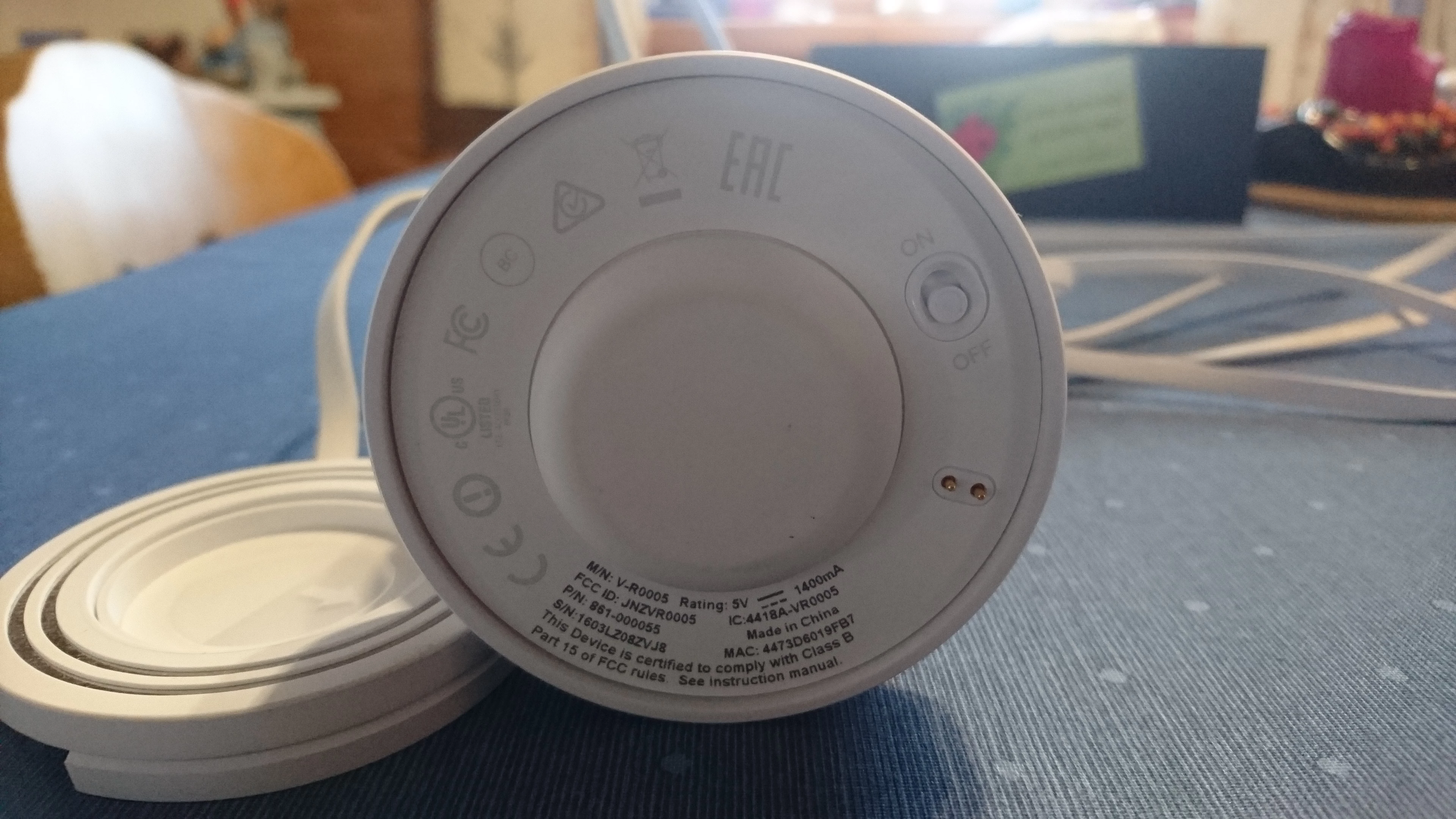 (Cam von unten mit Ein/Ausschalter und dem eingebauten Magneten. Das flache Teil ist die Ladeeinheit. Diese verbindet sich ebenfalls über den Magneten mit der Cam)
