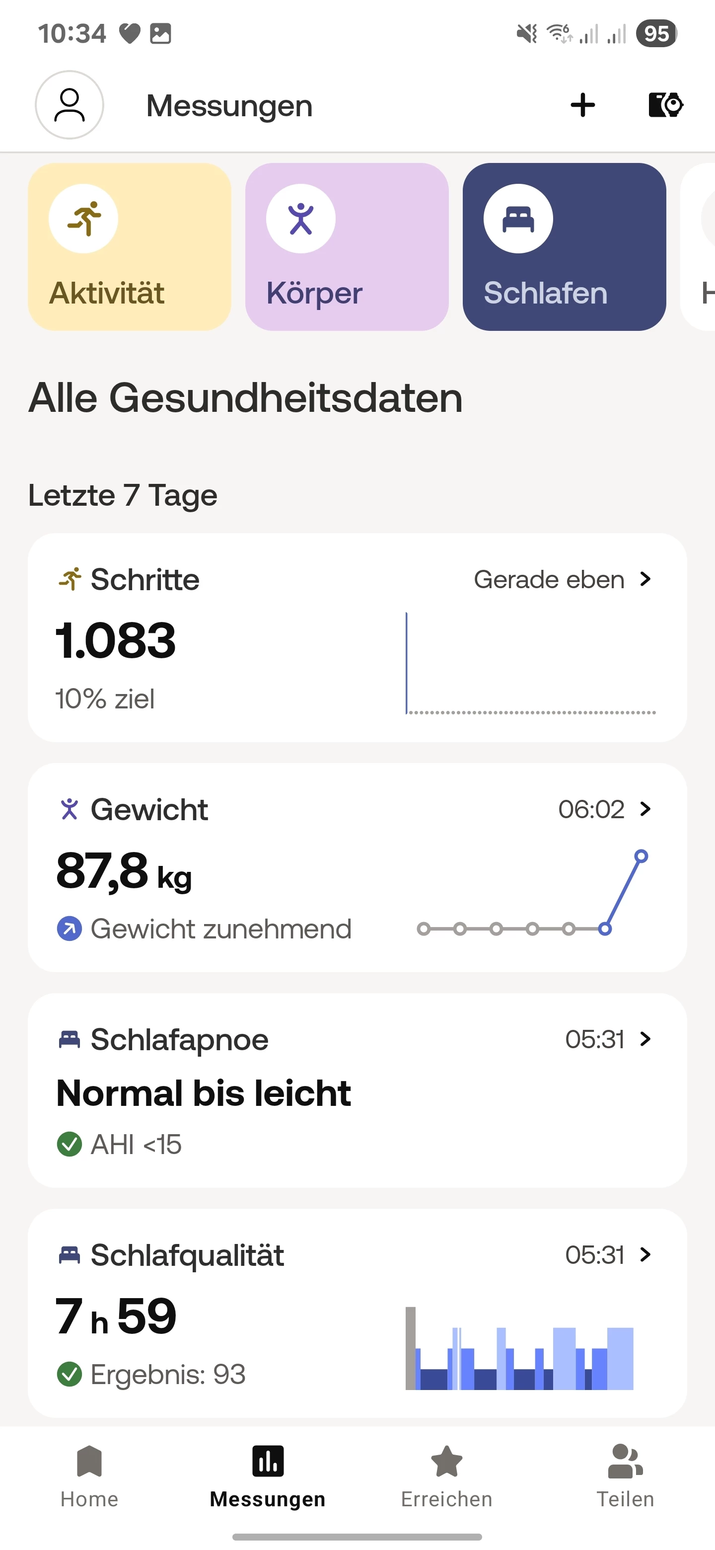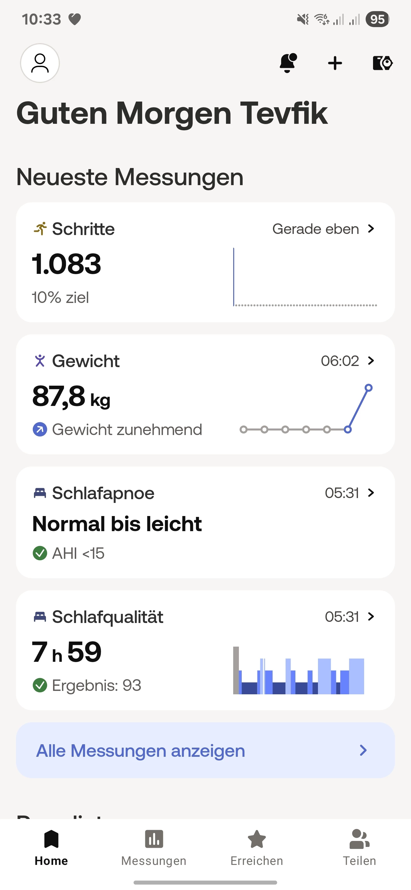 Die APP ist übersichtlich und ziemlich einfach gehalten, wie ich finde. Alle wichtigen Daten sind vorhanden die man benötigt. Sie ist in vier Reiter aufgeteilt mit Home (alle Daten auf einen Blick), Messungen (man kann sich alle Messungen einzeln anschauen), Erreichen und Teilen.