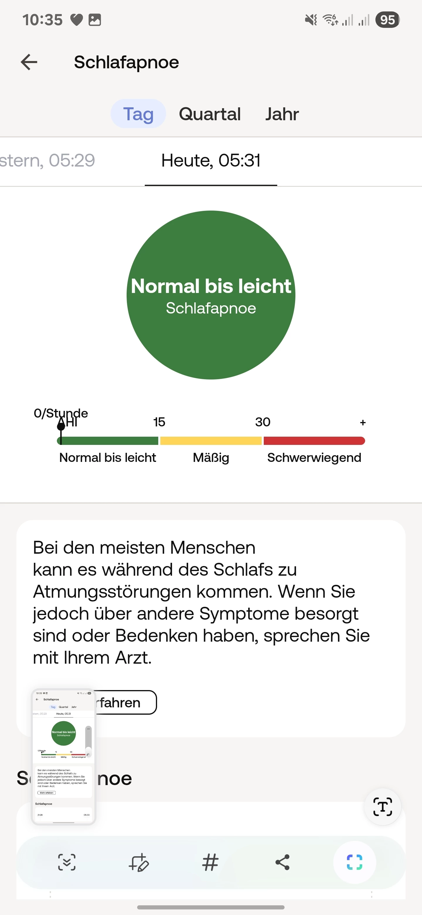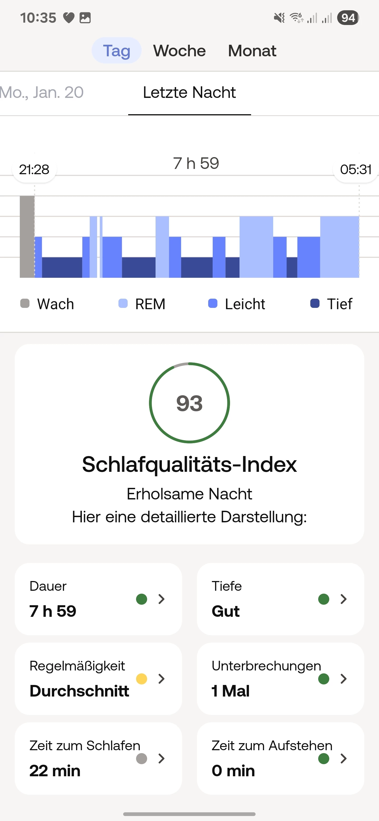 Des Weiteren werden die Schlafdauer, Einschlafzeit, Aufwachzeit, Schlafapnoe-Episoden mit Klassifizierung des Schweregrades und die Schlafphasen wie Tief-, Leicht- und REM-Schlaf gemessen. Die kontinuierliche und durchschnittliche Herzfrequenz sowie die Dauer von Schnarch-Episoden werden ebenfalls gemessen. Nach dem Aufstehen werden die Daten automatisch in der APP über WLAN Synchronisiert, was ich toll finde. Somit hat man seine Daten jeden Morgen im Blick.