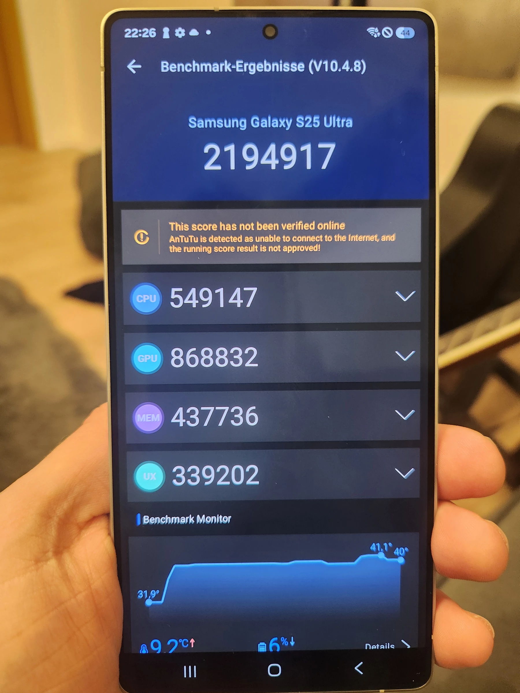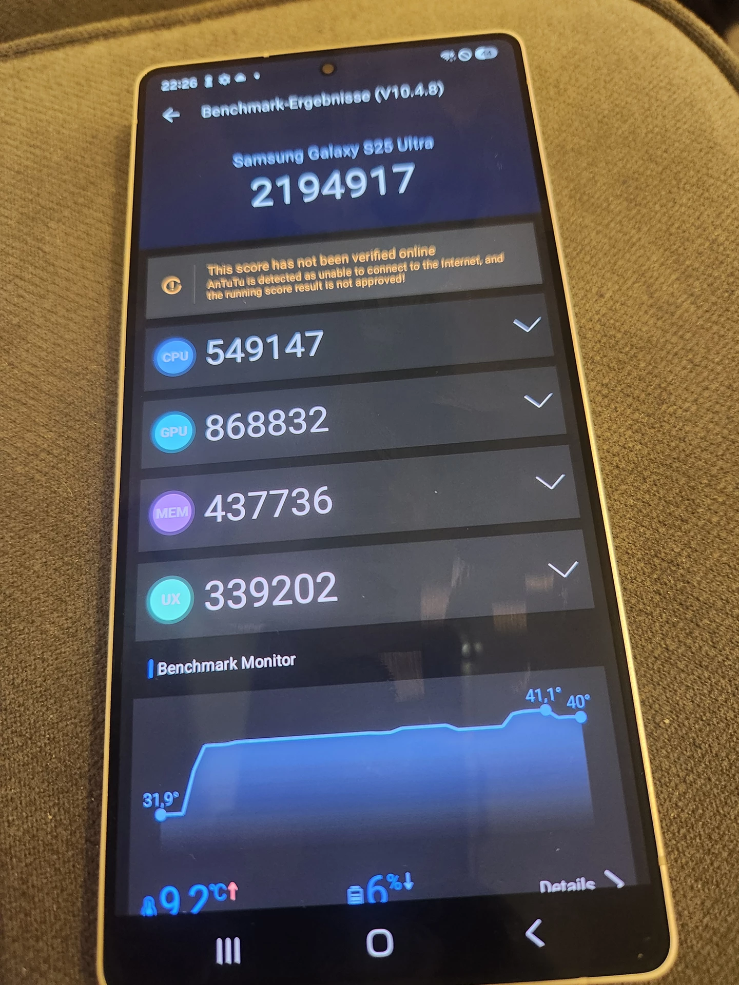 Ich werde hier kein großes Fass aufmachen und nerdische Fakten ohne Ende auf euch los ballern, da es dahingehend genug Tests im www gibt. Allerdings habe ich dennoch einen Antutu Benchmark laufen lassen und der Qualcomm Snapdragon 8 Elite “for Samsung” knallt hier wirklich alles weg, was es weg zu knallen gibt. MIt etwa 2.2 mio Punkte kann es keinen Menschen auf dem Planeten geben, der derzeit mehr Leistung fordern oder auch nutzen kann. Zum Vergleich: mein Z Fold 4 hat so um die 1mio Punkte. Das Fold 4 ist jetzt ca 3 Jahre alt und die Prozessor Leistung hat sich, im Zusammenspiel mit sehr guter Hard- und Software, mehr als verdoppelt. Wahnsinn!!!! Die derzeit schnellsten Smartphones bewegen sich bei etwa 2.6mio Punkte im Antutu Benchmark - beispielsweise das Xiaomi Mi 15 Ultra oder das Vivo X200 Pro. Viel mehr will ich dazu gar nicht schreiben. Ich schweife eh schon viel zu weit ab. So viel wollte ich insgesamt gar nicht schreiben 😀 Abschließend zum Thema Leistung: das Ultra meistert alle Aufgaben absolut spielend, ohne auch nur ansatzweise zu ruckeln oder zu puffern (nachladen) Selbst wenn man 100 Apps im HG laufen hat, merkt man keinen Unterschied. Ich habe zB auf dem Ultra Bilder bearbeitet und gerendert usw und nebenbei andere Dinge wie zB Videos oder Musik laufen lassen und das Ultra so: “Wann gehts eigentlich mit der Arbeit los?”