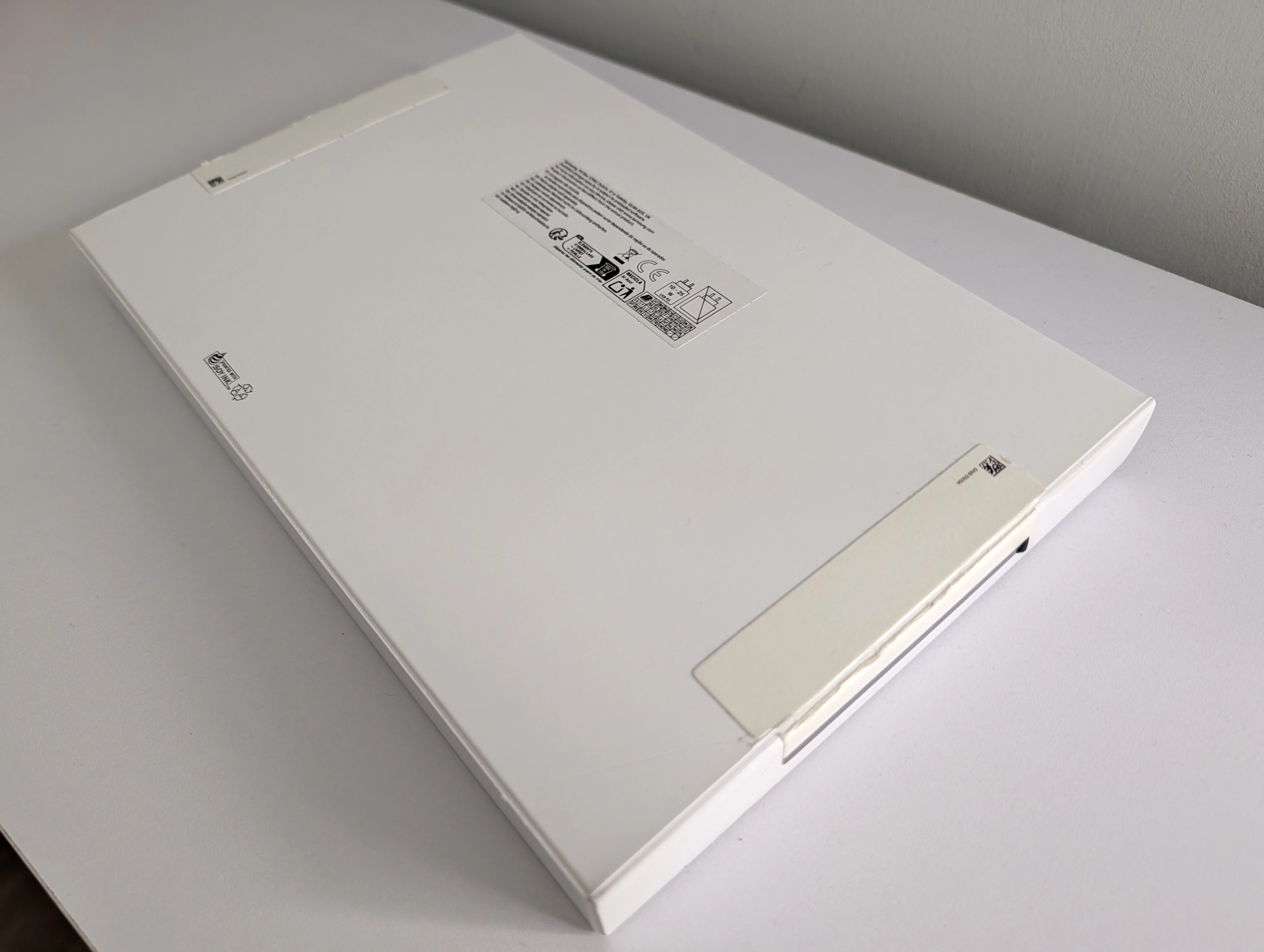 Beim Auspacken fällt sofort auf, dass es sich um ein Mittelklasse-Tablet der unteren Preisregion handelt. Der Karton ist aus leicht rutschiger, dünner Pappe und hat keine Laschen, um die Versiegelung abzuziehen. Es war sogar sehr schwer, mit meinem Unboxing-Messer die Verpackung beim Öffnen des Klebebandes nicht zu beschädigen.