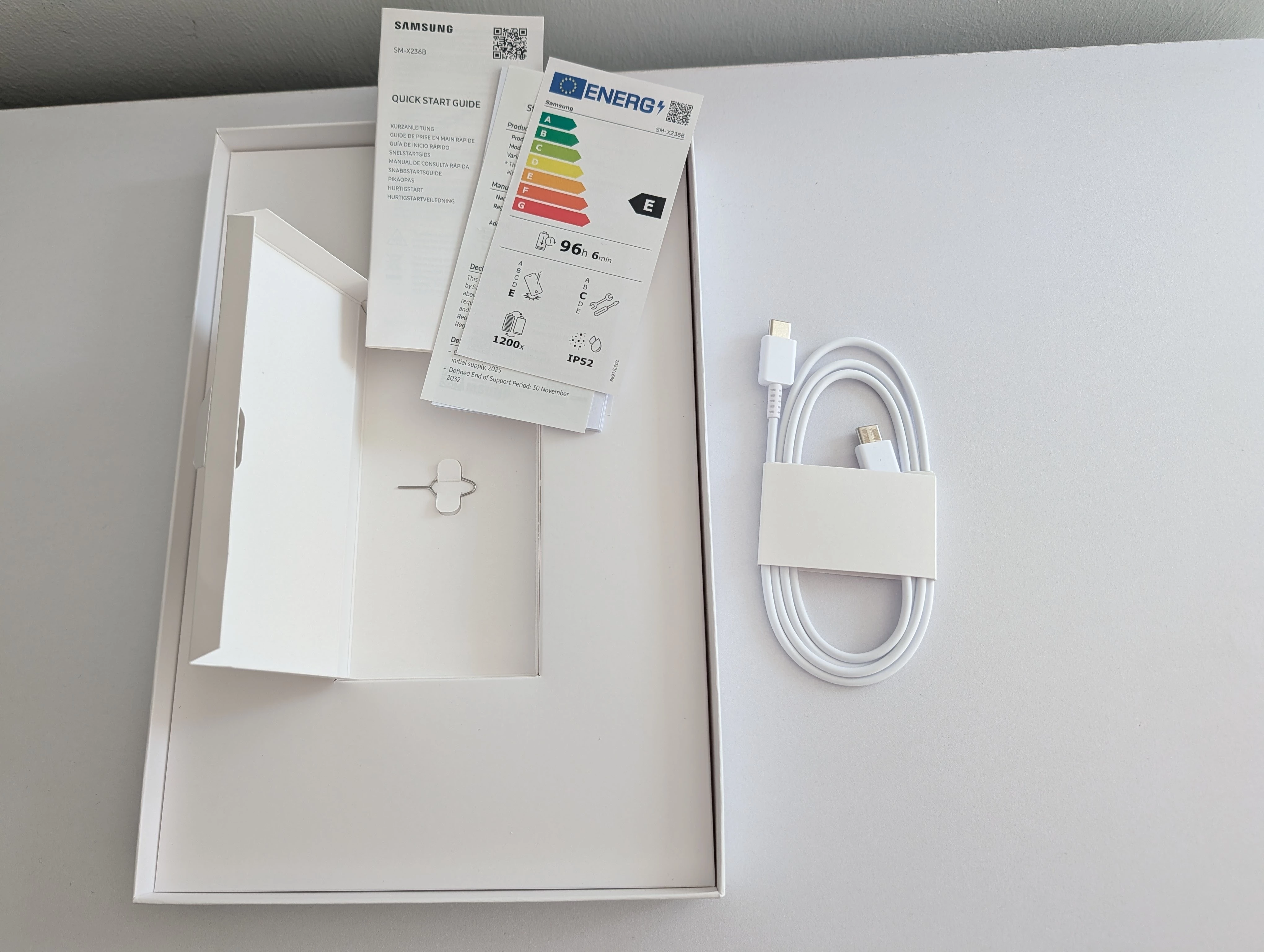 Nach kurzem K(r)ampf war es dann endlich möglich, das Tablet aus der Verpackung zu ziehen. Im Lieferumfang befinden sich das Tablet (in Papier gehüllt), ein weißes USB-C auf USB-C (2.0) Kabel zum Laden sowie ein SIM-Eject-Tool zum Öffnen des Schachtes, in den ihr eine Nano-SIM und eine Micro-SD-Karte einlegen könnt. Und natürlich etwas Papierkram, den eh keiner liest.