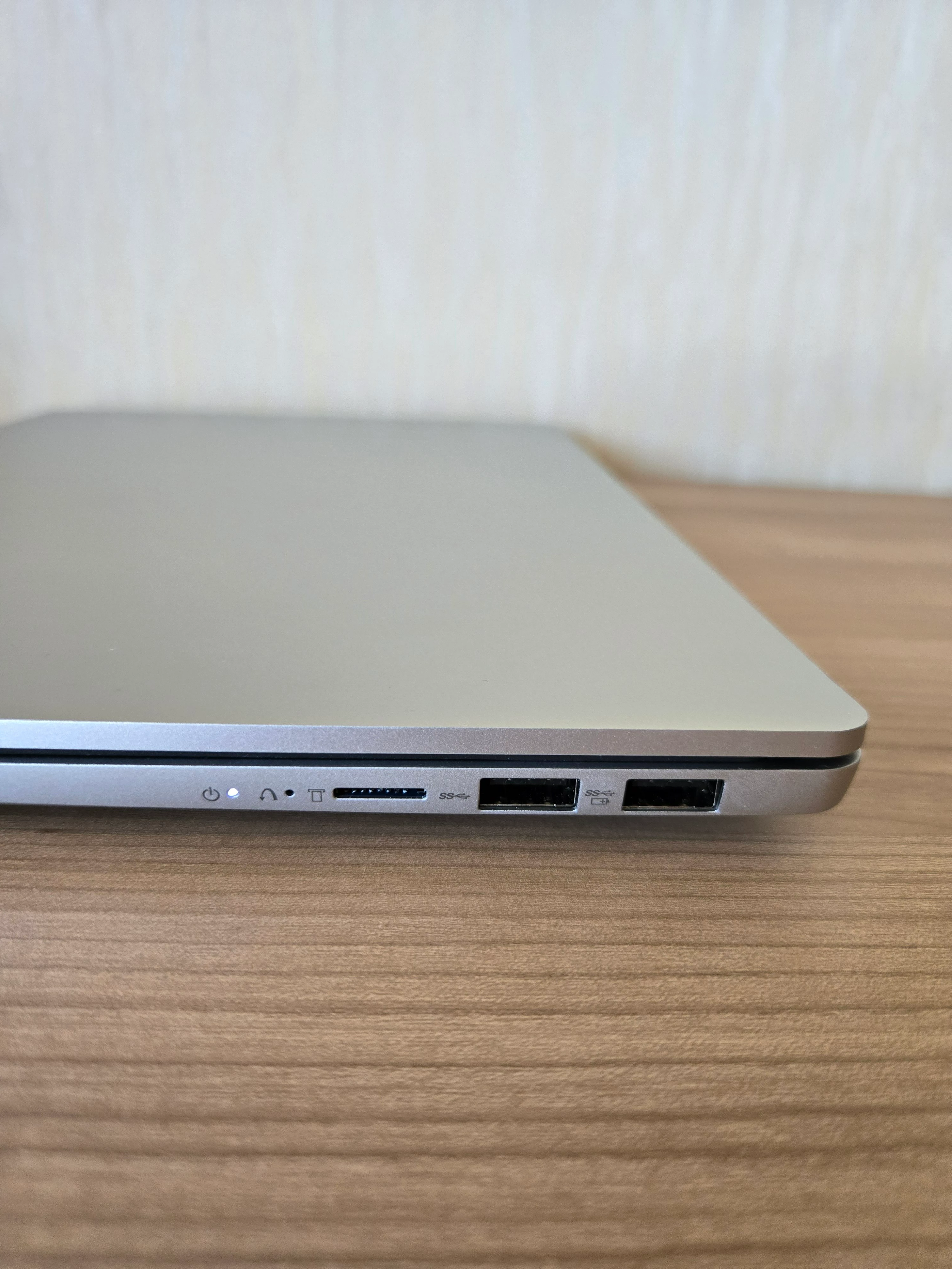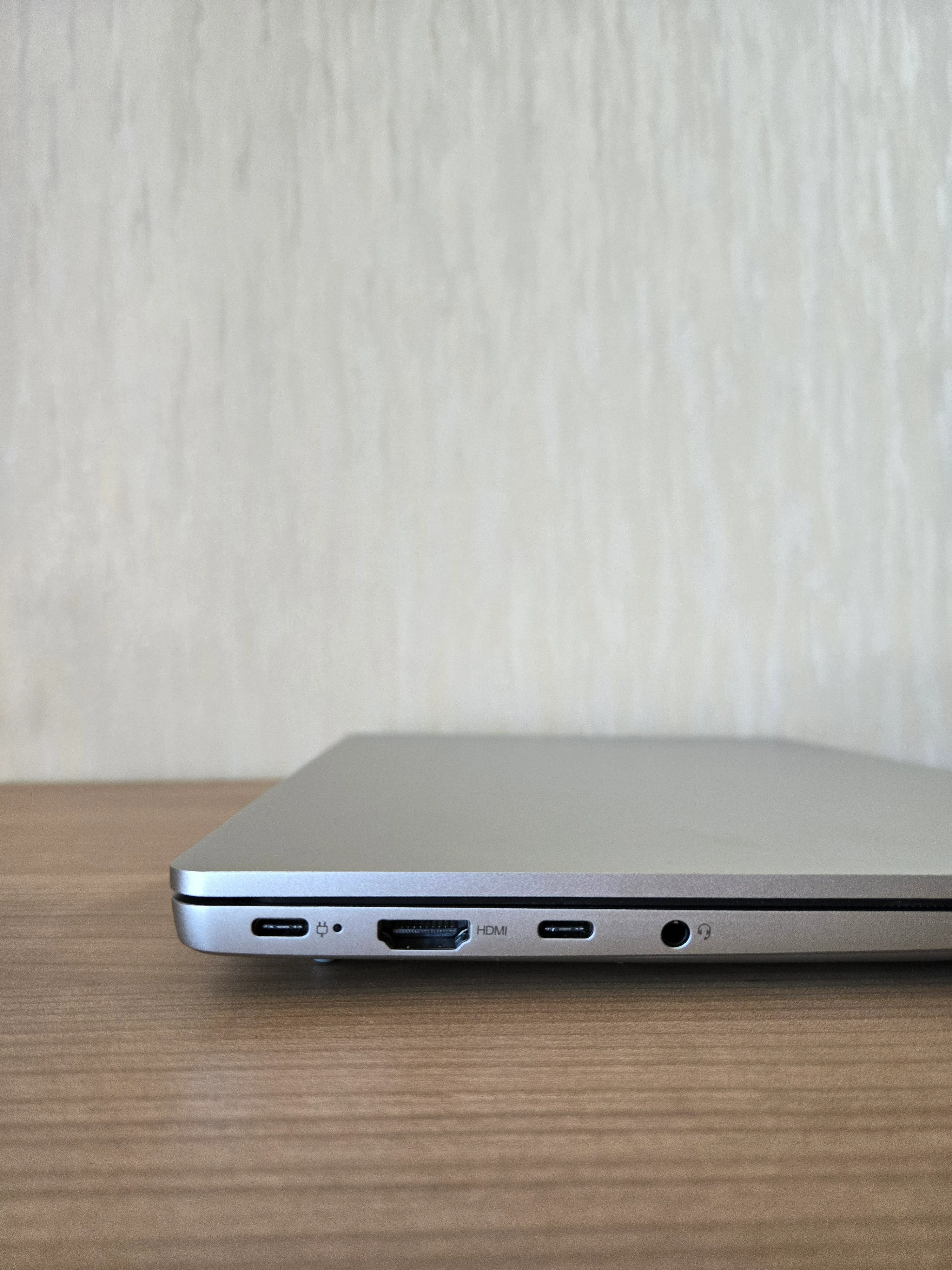 Auf der linken Seite befinden sich zwei USB-C (10 Gbit/s) Anschlüsse, ein HDMI 1.4 (max. 4K 30 Hz) Port, ein Kopfhörer/Mikrofon-Kombianschluss.
