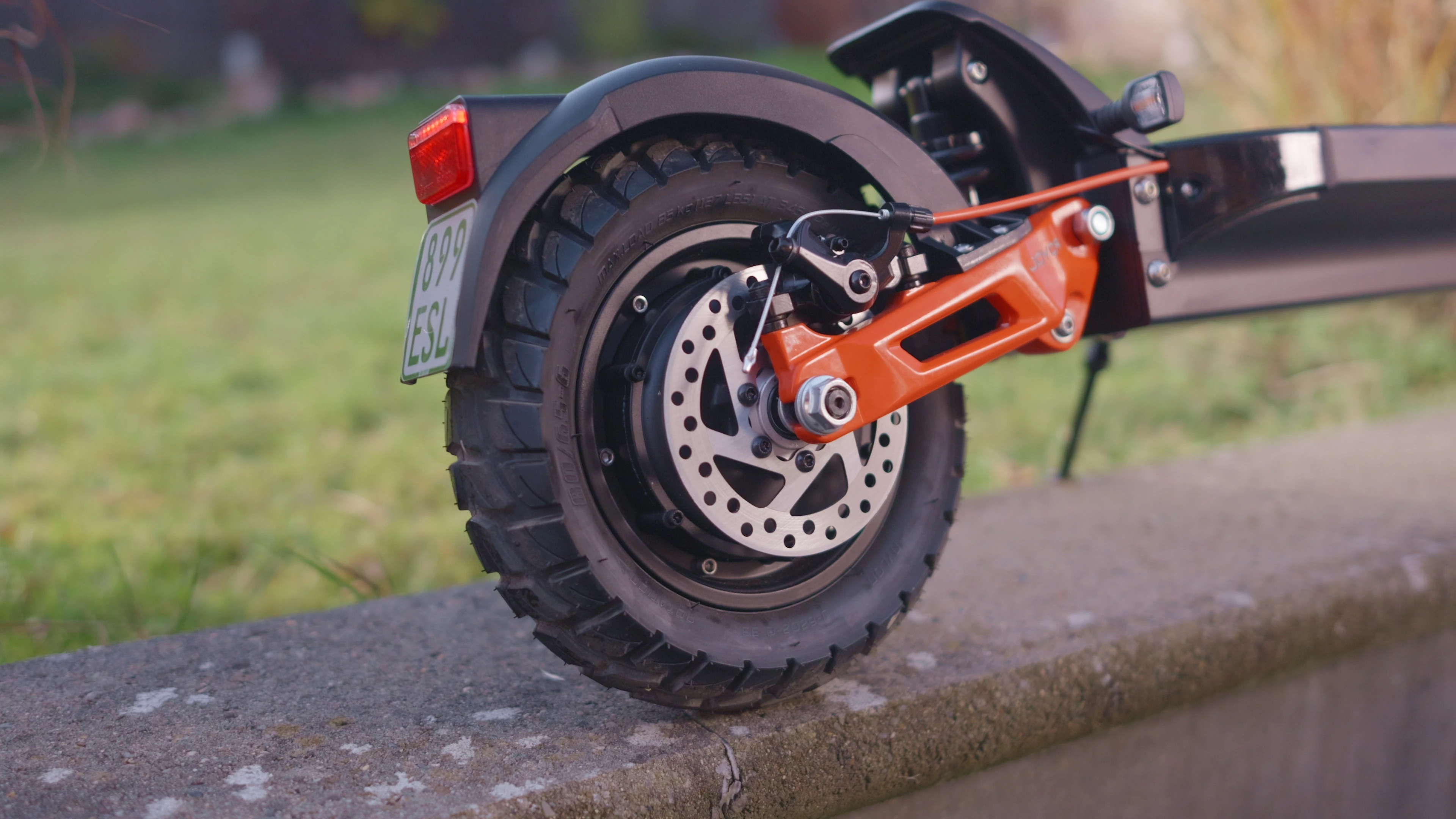 Es gibt kein Klappern oder störende Geräusche beim Ausfedern – anders als bei vielen anderen Modellen, die ich schon testen durfte. Selbst beim Springen auf dem Scooter schlug die Federung bei meinem Gewicht von etwas über 80 kg zu keiner Zeit bis zum Anschlag durch. Eine absolut souveräne Leistung.