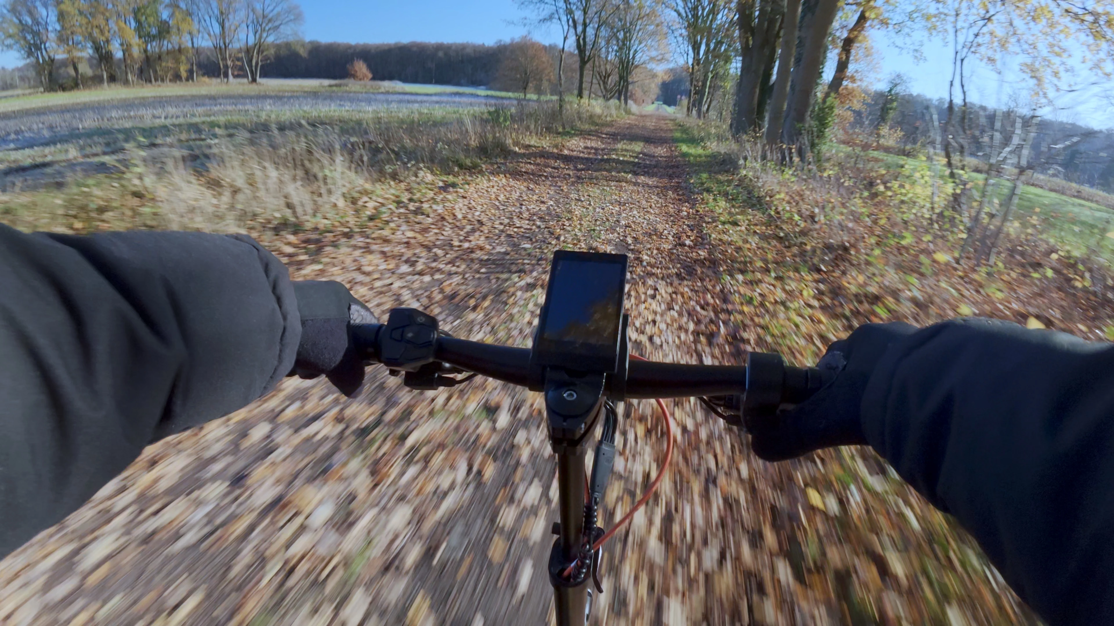 Der Scooter liegt im Allgemeinen extrem satt auf der Straße. Besonders hervorzuheben ist die Geräuschkulisse: Der Joyor T6E Pro ist extrem leise. Es gibt kein Klappern vom Schutzblech, der Federung oder dem Klappmechanismus. Man gleitet komfortabel und leise dahin, selbst auf unwegsamem Untergrund.