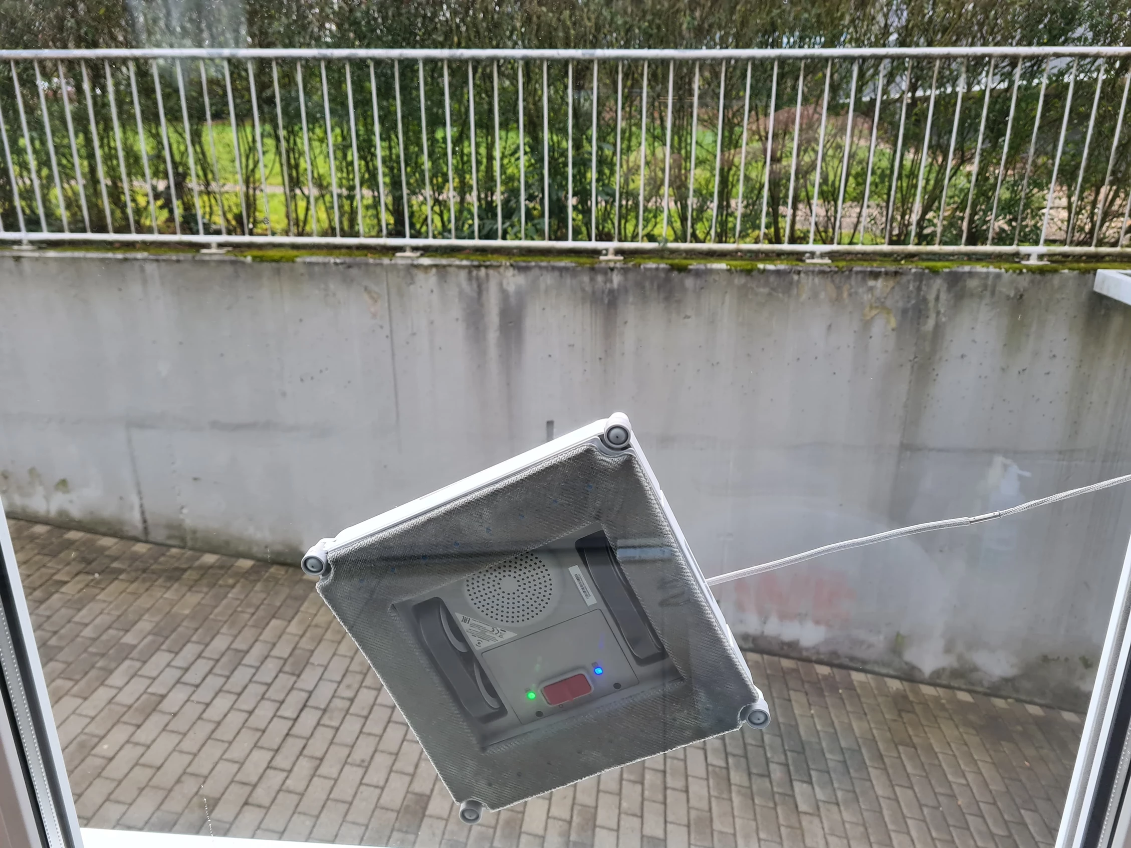 Bevor der Roboter durch Knopfdruck startet, muss man den Saugnapf angebracht haben, sonst kommt es zu einer Fehlermeldung und er startet nicht. Ich hatte den Saugnapf während des Betriebs meist an einem benachbarten Fenster angebracht, so dass der Roboter ausreichend Leine hatte. Der Roboter saugt sich anschließend nach Knopfdruck an der Scheibe fest und startet.