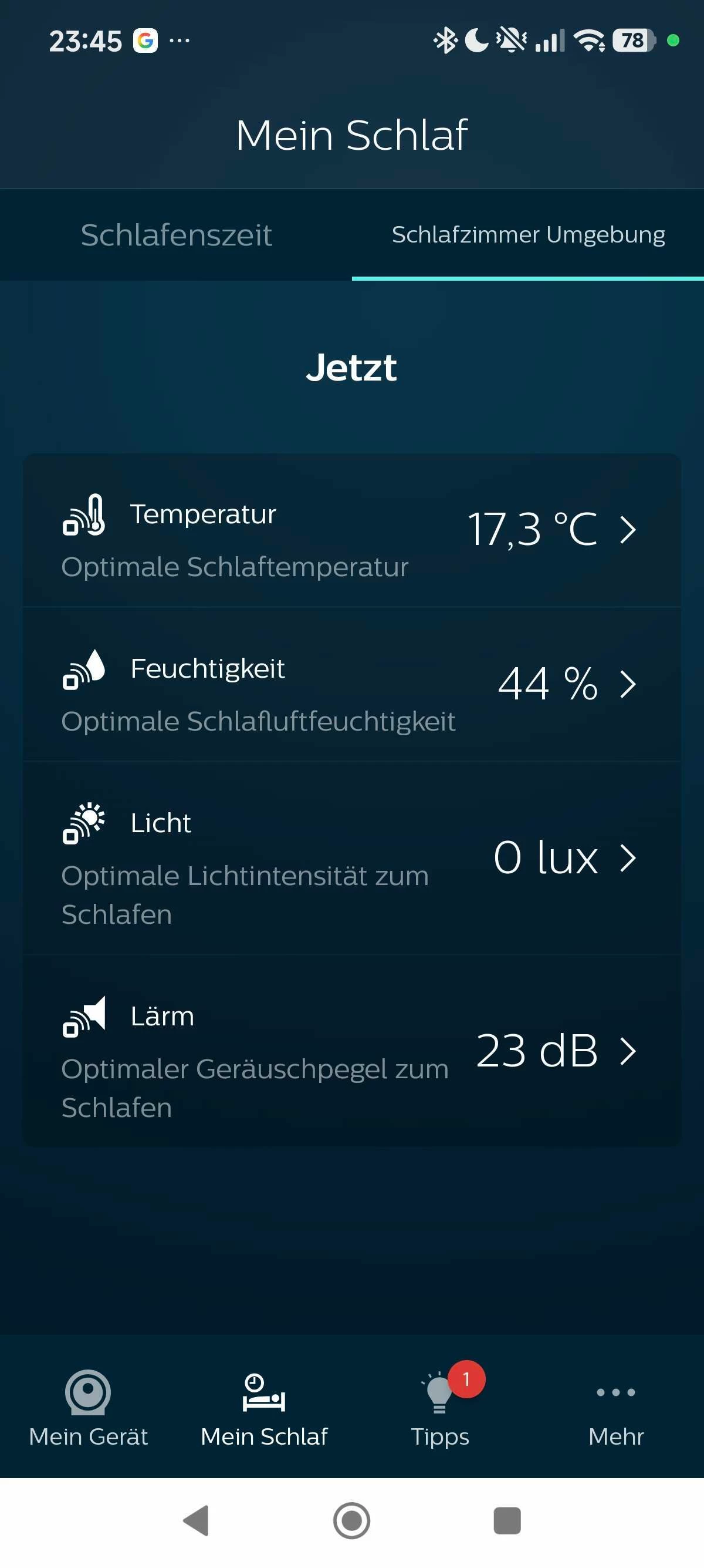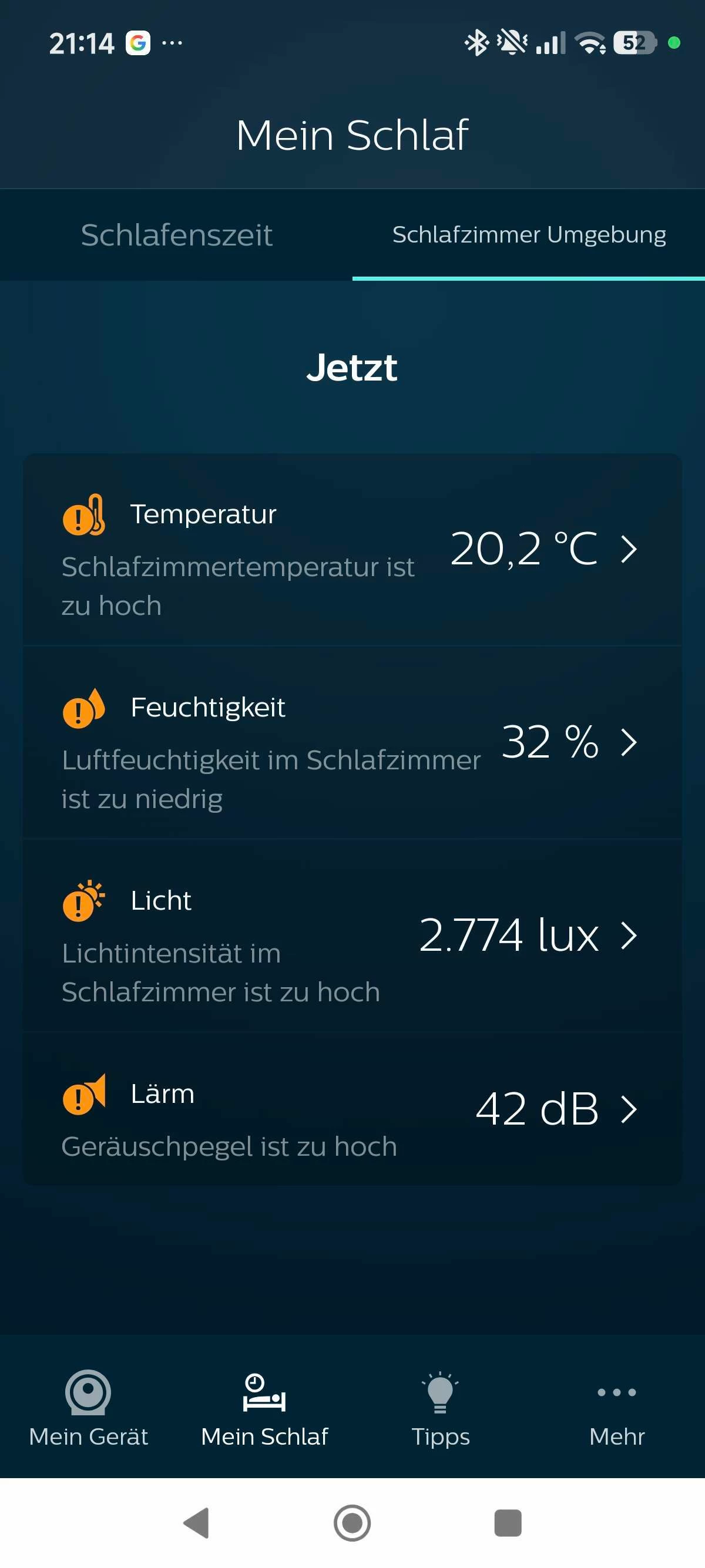 Die Smart-Daten (Temperatur, Luftfeuchtigkeit, Geräusch, Lux…) wirken dabei eher wie sanfte Einordnung als Kontrolle. Kein Score, kein Druck, sehr angenehm. Der große Haken liegt bei der Connectivity: Das Gerät funktioniert nur im selben WLAN. Kein Gateway, keine Steuerung von unterwegs. Wer mehrere WLANs nutzt, landet schnell im falschen Netz. Das ist 2025 unnötig und ein echter technischer Flop.