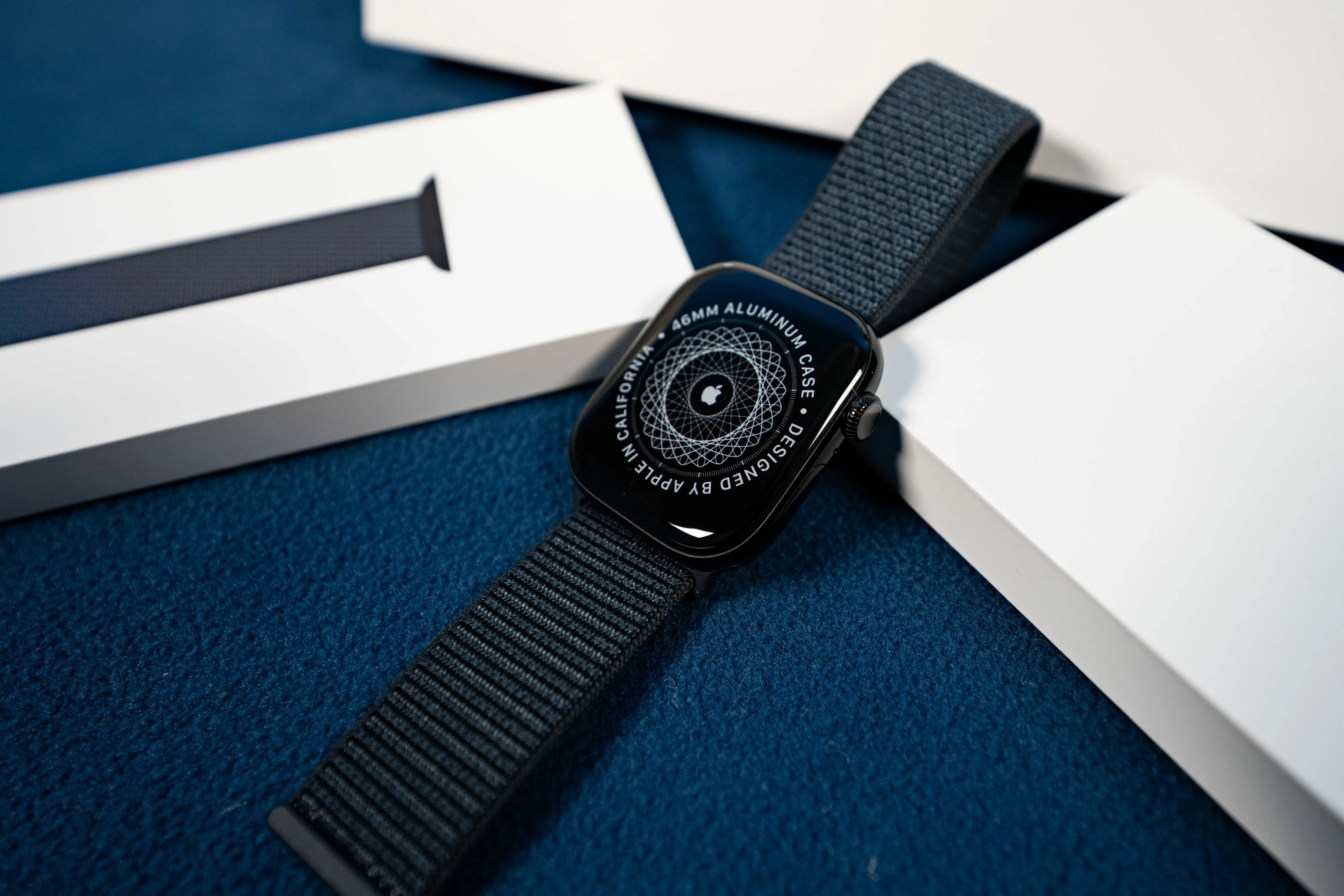 Apple Watch 10 und die Verpackung auf einem Tisch mit blauer Decke