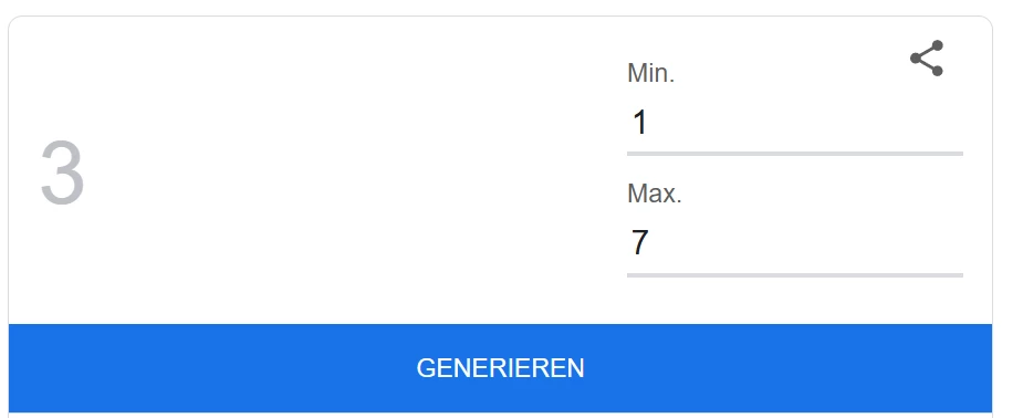 So, nun zur Auslosung: Wie immer habe ich den Zahlengenerator angeworfen, jedem Menschen der Reihenfolge nach eine Nummer gegeben und den Generator eine Zahl zwischen 1 und in diesem Fall 7 finden lassen: Das Ergebnis ist