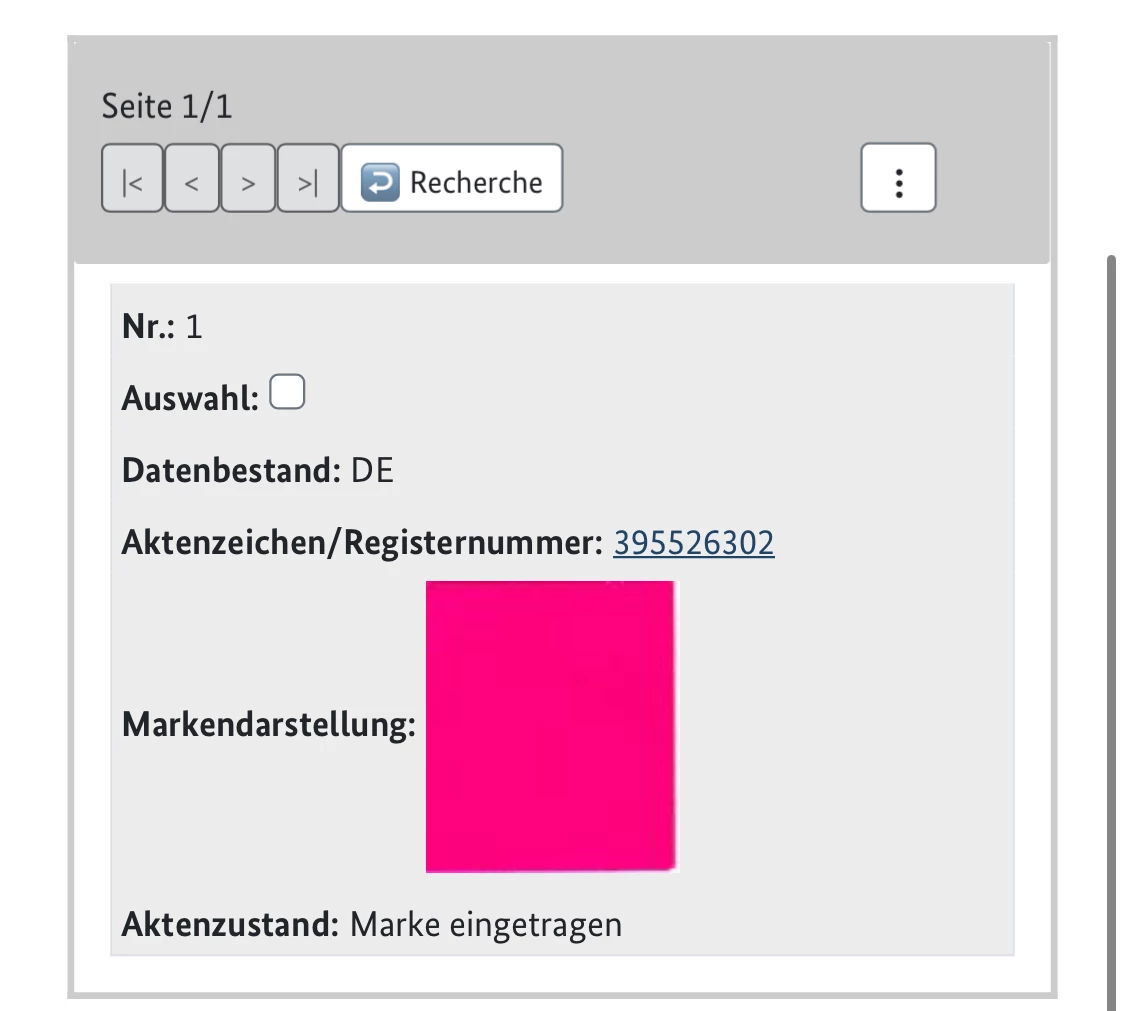 Die Nummer 395526302 ist kein geheimer Testcode, sondern ein Eintrag im deutschen Markenregister (DPMA) — sie verweist auf die eingetragene Farbmarke „Magenta“ der Deutschen Telekom. Interessant, dass Farben sogar markenrechtlich geschützt werden.
