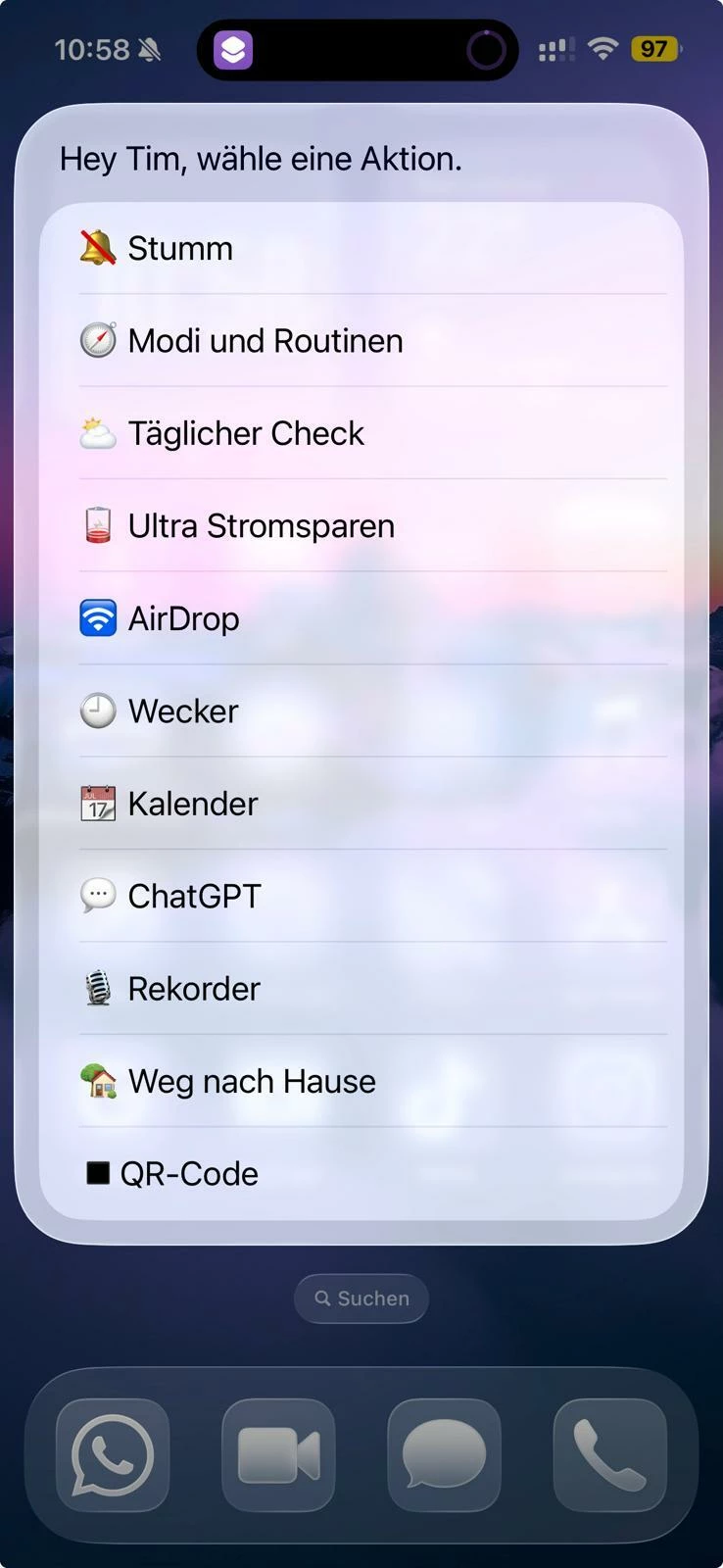 Mein Actionbutton-Menü. Jeden Tag nutze ich den Actionbutton. - Eine der besten Funktionen des iPhone.